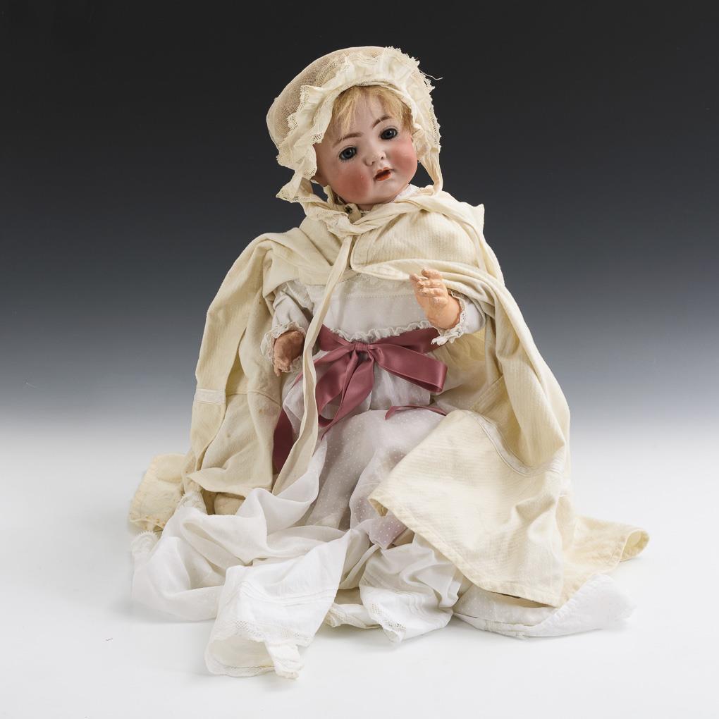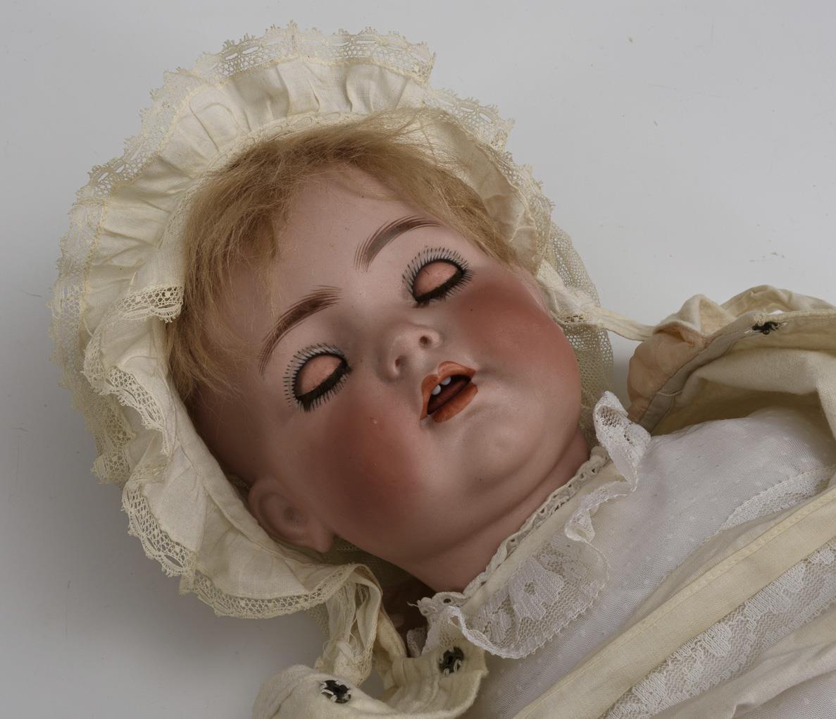 Crank head, blue sleeping eyes, eyelashes, matching completed mohair wig (original old wig attached). 5-piece sitting baby body. Dressed in white baby outfit: Underwear, christening robe, cape, cap. Head x-rayed: without defects.