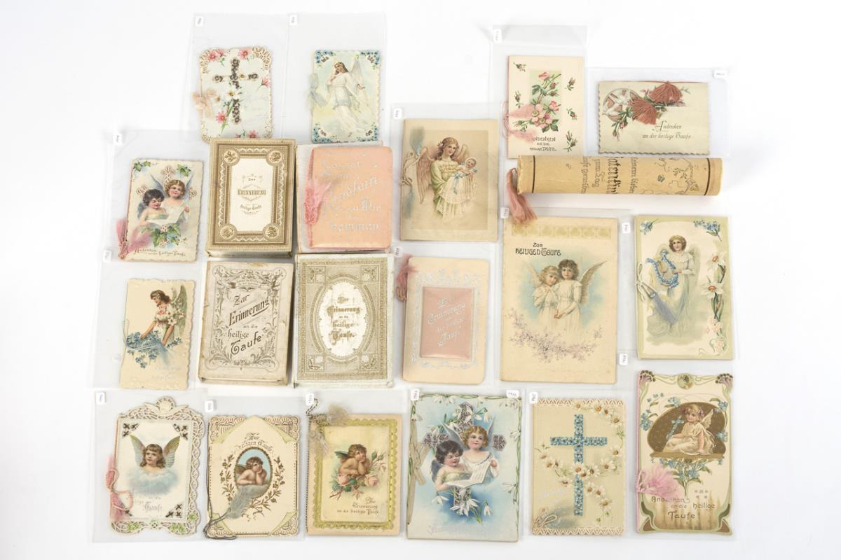4 cardboard caskets in book form with laminated title on the lid; inside 1x as picture box with John the Baptist (color lithographs), 2 envelopes with velvet, 1 decorative envelope with gauze, embossed paper, color lithographs and fabric rose. 1 rolled baptismal letter in printed cardboard roll case. 16 loose baptism cards. Cases some signs of age / use, 1x hinge glued....