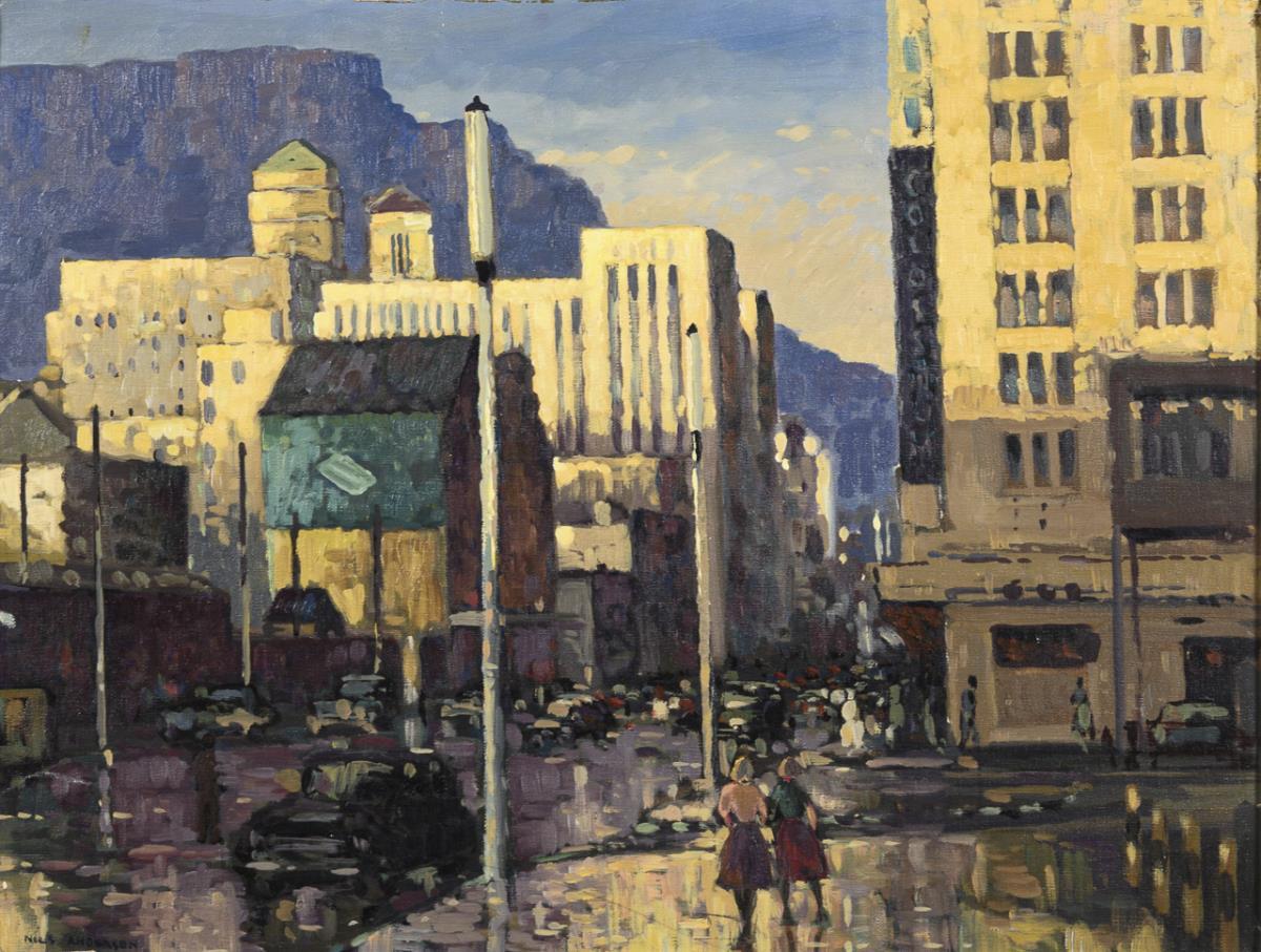 Staffage figures on the streets of the South African city at dawn.