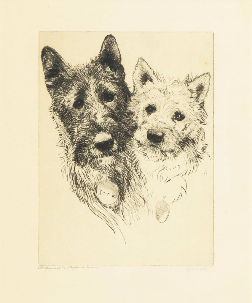 Animal portrait of two terriers. Sheet somewhat light browned.