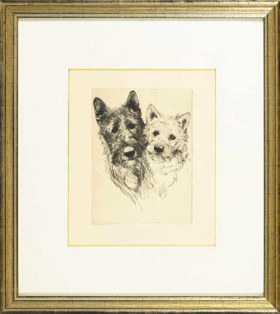 Animal portrait of two terriers. Sheet somewhat light browned.