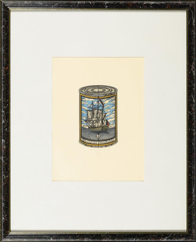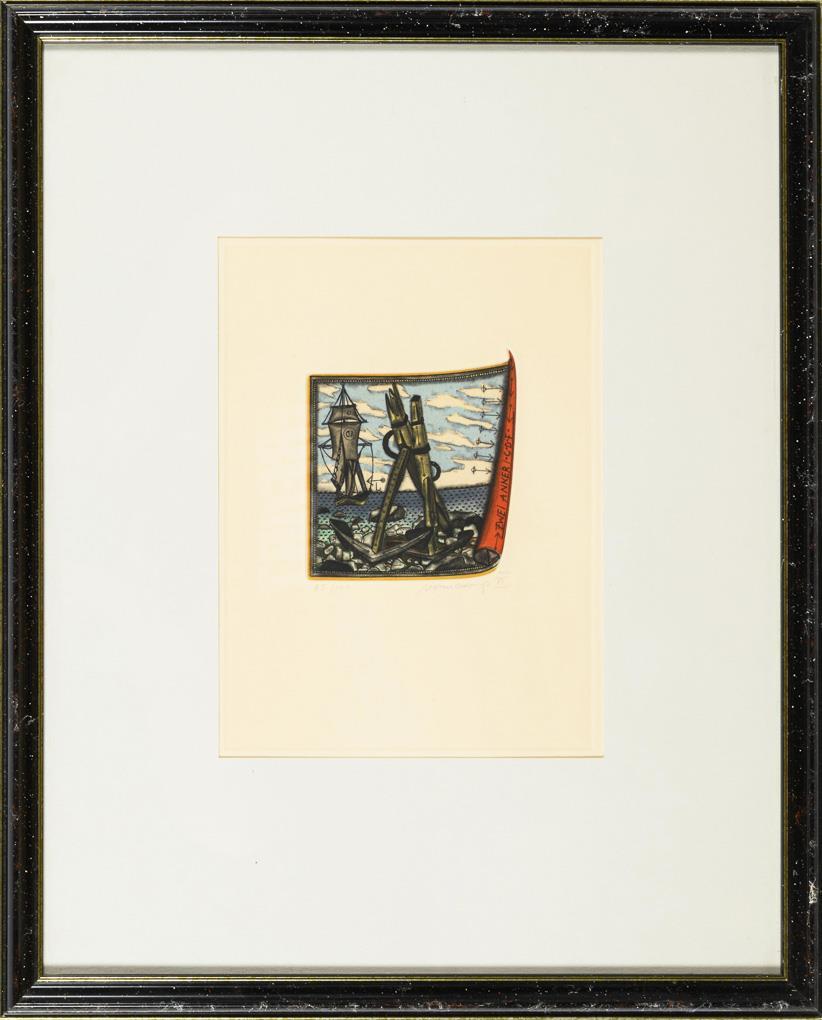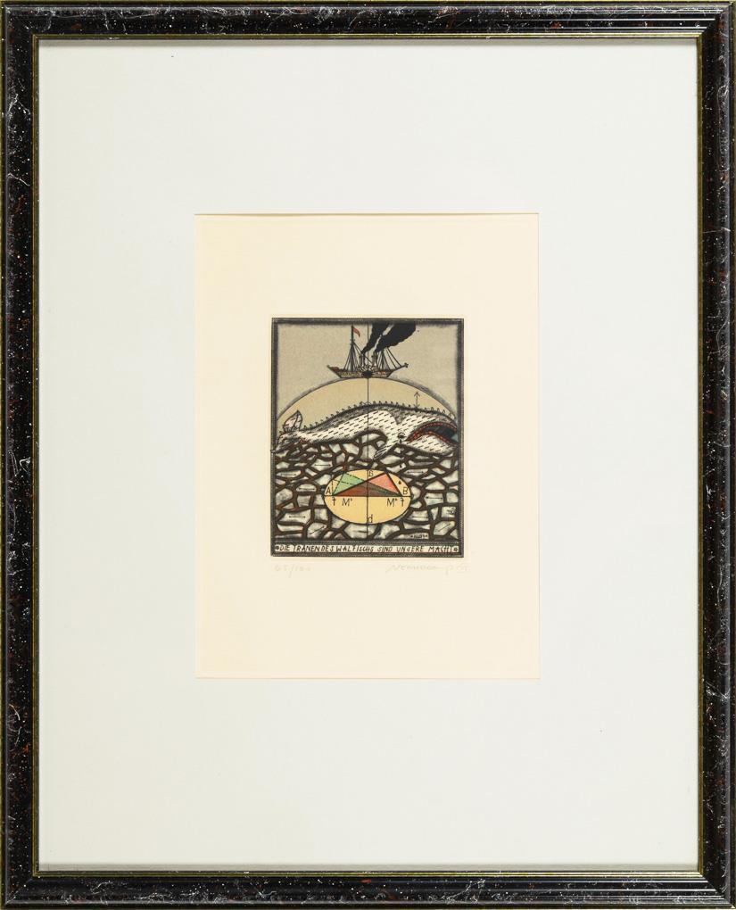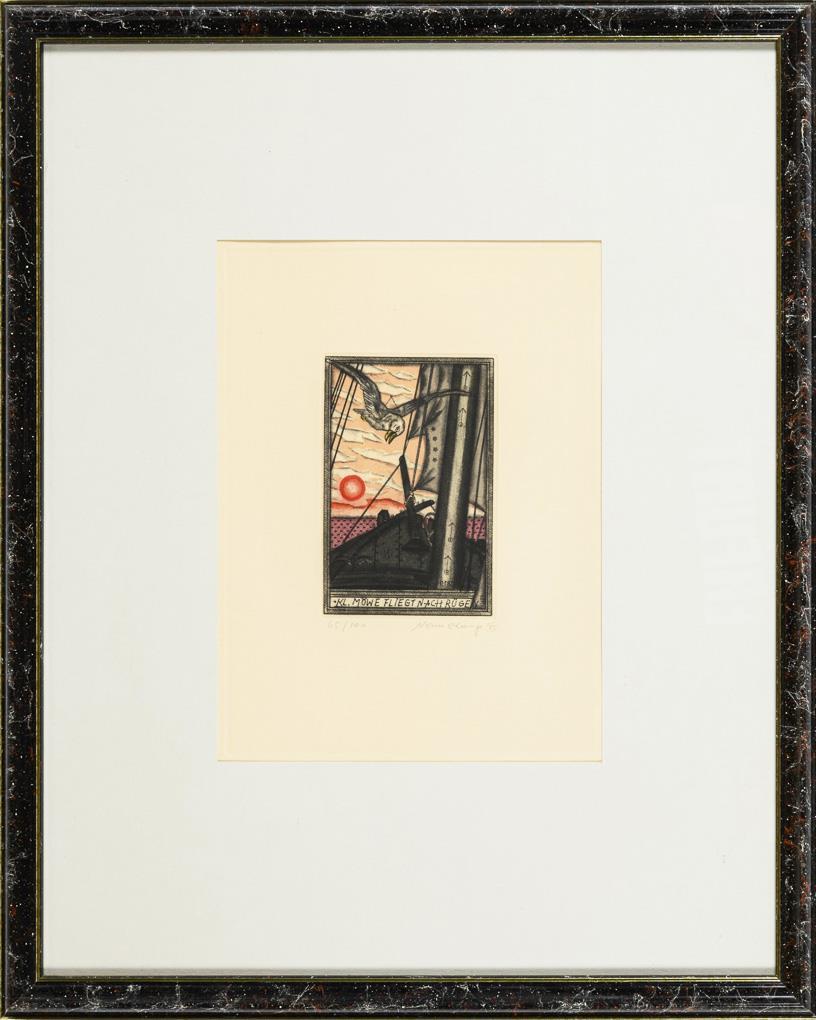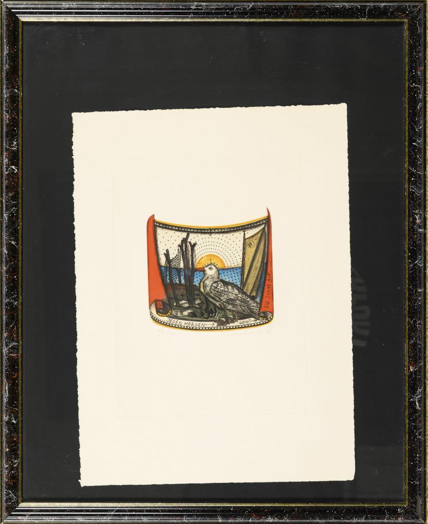 "The tears of the whale are our power", printing plate: 14.7 x 11.7 cm | "Little seagull flies to Rügen", printing plate: 14.2 x 9.5 cm | "Every morning the sun rises", printing plate: 12.5 x 13 cm | "1824 Baltic Sea conserved", printing plate: 14 x 9 cm | "Two anchors", printing plate: 12 x 11 cm | "Odyssey", printing plate: 19.5 x 15 cm, framed & behind glass: 43 x 34 cm, copy: 15/100, embossed stamp "Galerie Schmücking", sheet light browned.