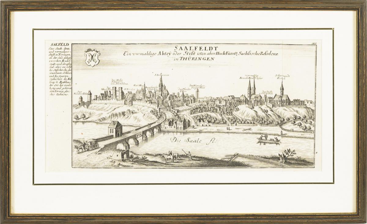 Historical view of the city of Saalfeld from the central perspective, in the foreground the river Saale, titled "Saalfeldt Ein vormahlige Abtey oder Stift ietzo aber Hoch=Fürstl: Sachsische Residenz in Thüringen", upper left city coat of arms, left margin with accompanying text; sheet 143 from: "Europens Pracht und Macht in 200 Kupfer-Stücken", 1664-1758. Sheet somewhat foxed, glued together on the right edge.