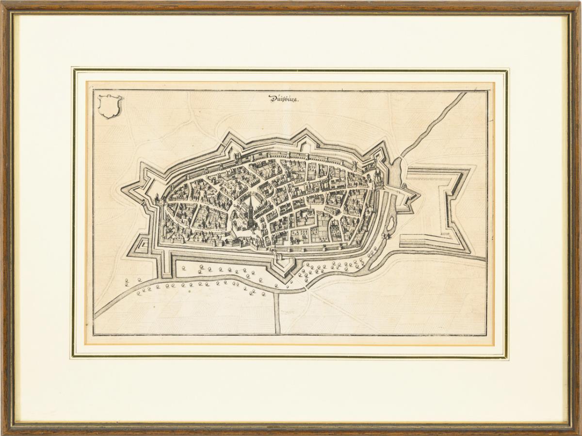 Historical bird's-eye view of the city of Duisburg, titled "Duißburg"; from volume 8 of the "Topographia Germaniae". Bow crease, sheet light browned.