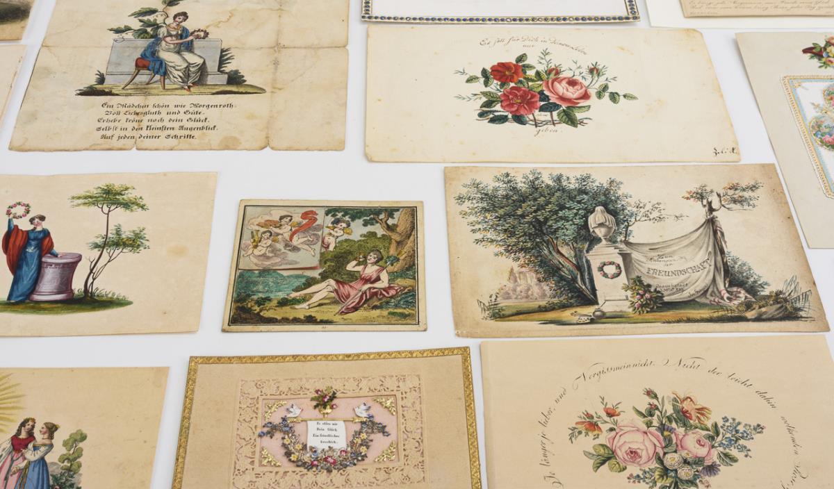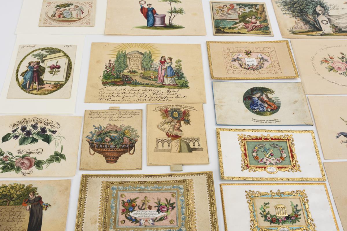 8 watercolors or watercolored, 12 colored lithographs (including 3 train maps), 7 cards from embossed and painted, partly gold-staffed paper composed in small parts, in mostly magnificent framing, 1 embossed color lithograph with 2 laminated flower wafers. Few with strong signs of age / use (tears, fold marks, foxing, 1x trimmed).