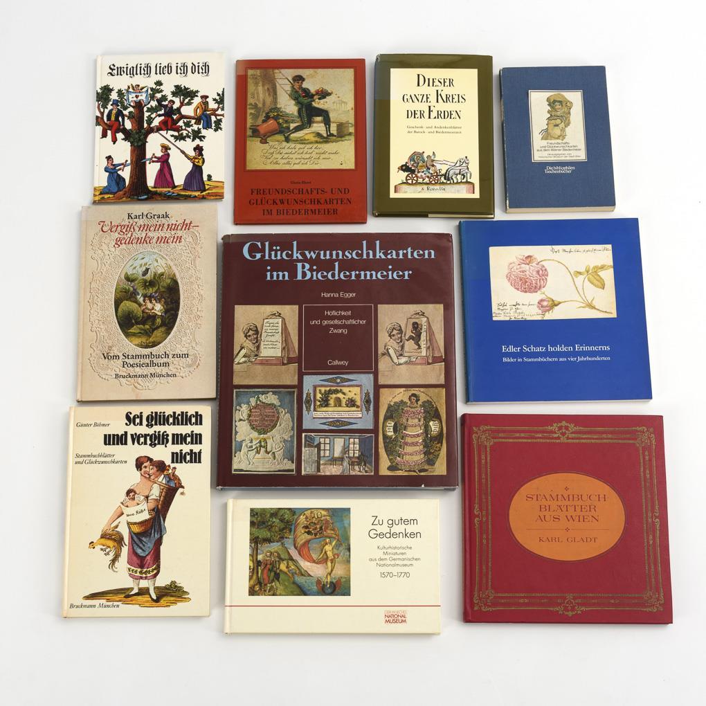 Egger: Greeting cards in the Biedermeier. / Gladt: Stammbuchblätter aus Wien. / Taegert: Edler Schatz holden Erinnerns. / Böhmer: Sei glücklich und vergiß mein nicht. / Graak: Vergiß mein nicht - gedenke mein. / Ehret: Friendship and greeting cards in the Biedermeier. / Weninger: This whole circle of the earth. / Böhmer: Ewiglich lieb ich dich. / Witzmann: Friendship and greeting cards from the Viennese Biedermeier. / Kurras: To good memory. 1x edges minimally bumped, 1 dust jacket slightly torn.