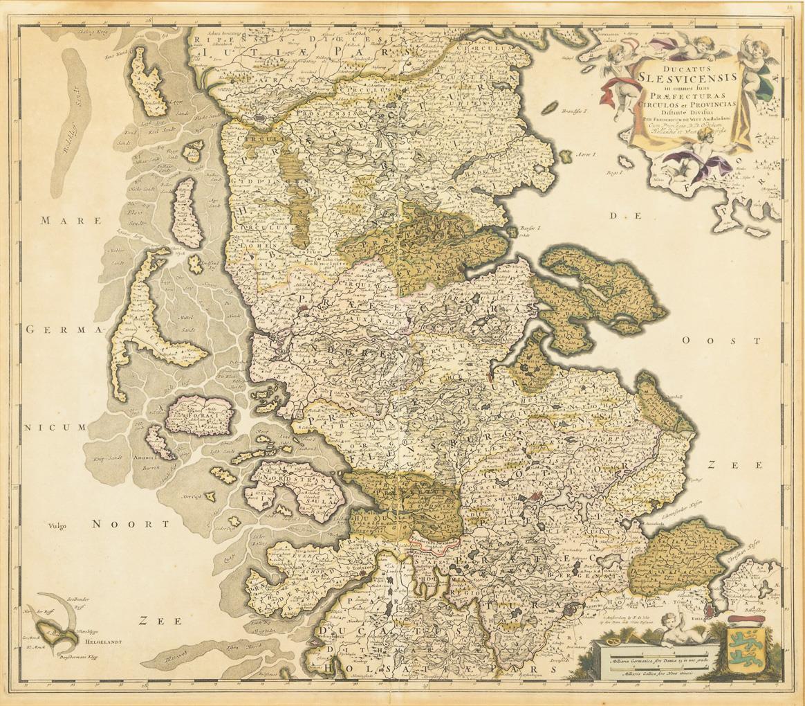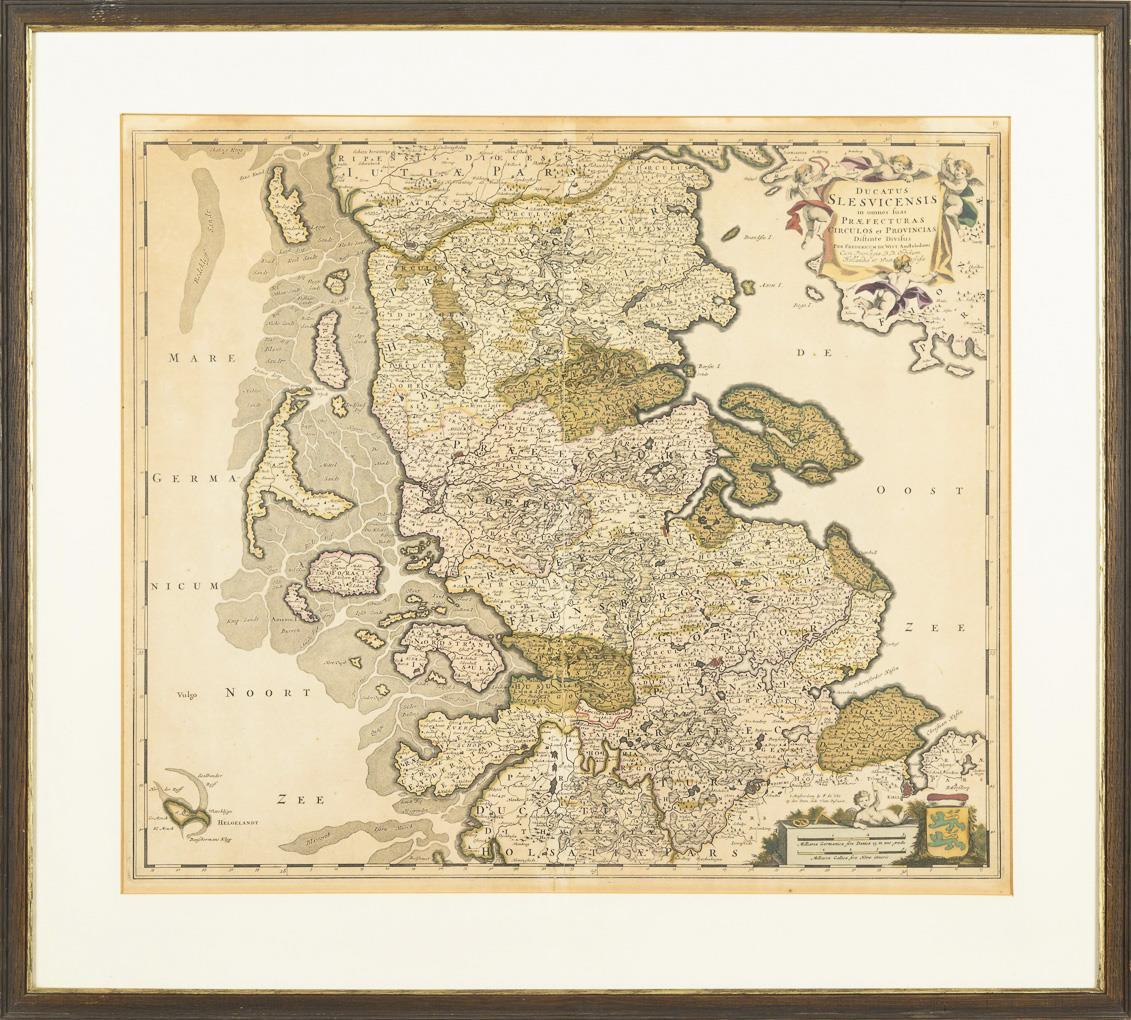 Detailed map of the Duchy of Schleswig, with figural title cartouche "Ducatus Slesvicensis in omnes suas Praefecturas Circulos et Provincias Distinte Divisus [...]" and mileage indicator. Sheet more light browned, centerfold torn.