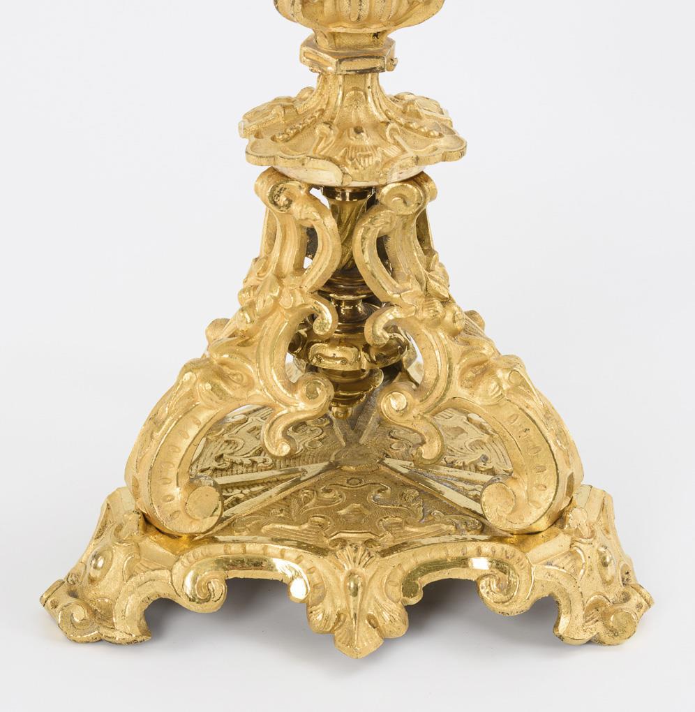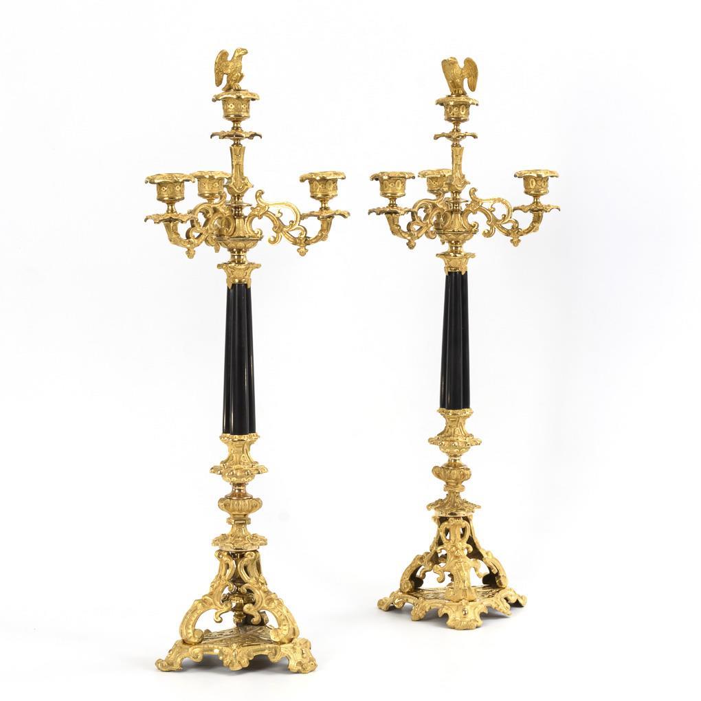 Very elaborately crafted candlestick with exceedingly rich, partly polished Reliefzier on the 3-sided base, vase shaft base and the crown with 3 volute arms as well as Napoleonic eagle figure as a flame extinguisher on the raised central spout. 2 minimal hairline cracks in the bronze, small chips and professional repair on the marble.