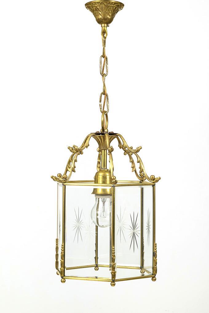 1-flame ceiling lantern with 6-cornered, faceted glazed body with notch decoration, on curved struts with chain suspension and bell canopy. Minimal signs of age/use.