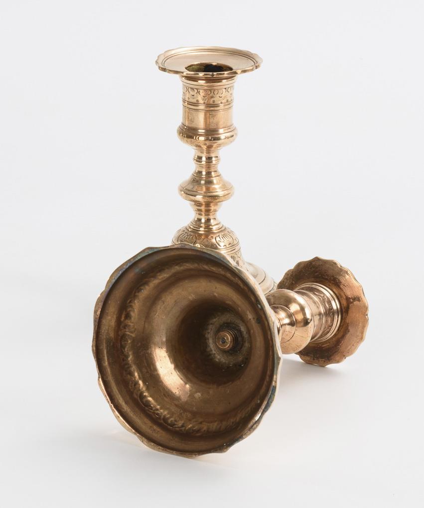 Bronze chandelier with curved rim on stepped round base, baluster stem and vase spout with insert wax plate. Foot and spout ornamentally punctured. Scarcely any signs of age/use.