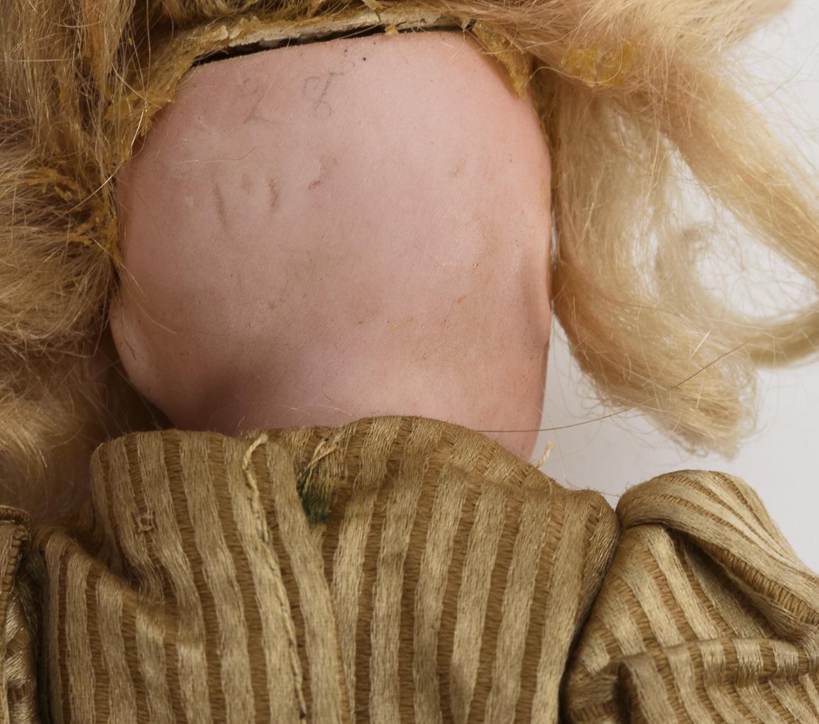Crank head, brown sleeping eyes, blond mohair wig. 5-piece standing doll body with long narrow legs. Light brown striped dress, white shoes and white cap. Left thumb missing.