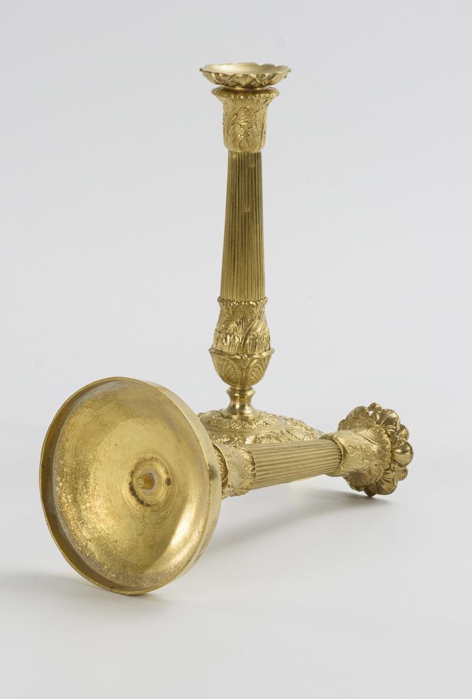 Bronze chandelier with rich relief decoration (floral tendril and leaves) at the foot, base of the shaft and the spout and fluted shaft. 1 minimal hairline crack at the edge of the foot.