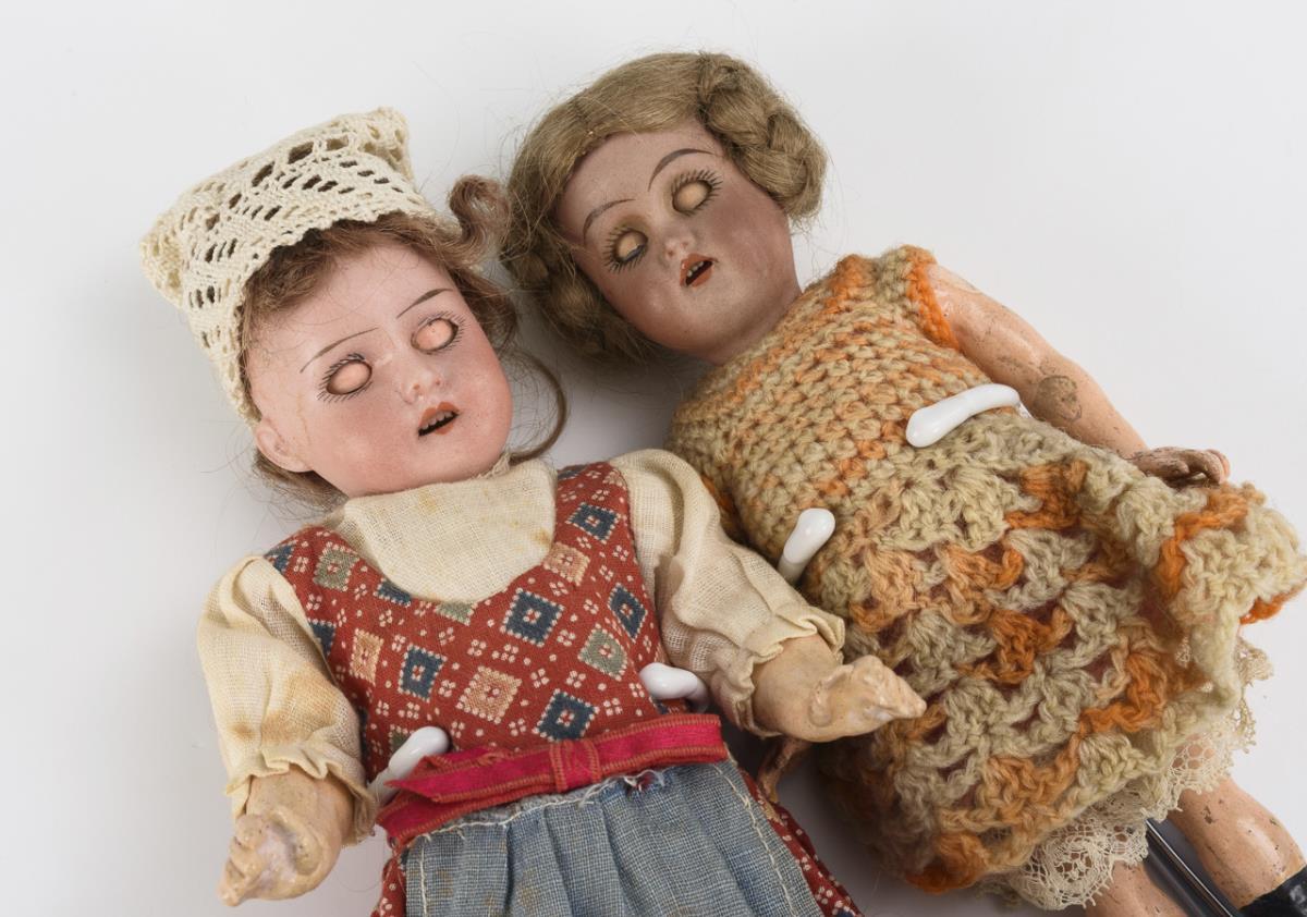 Larger dollhouse dolls, each with crank head, mohair wig and 5-piece standing doll body. 1x blond with crochet dress and modeled shoes, 1x brown with dirndl. 1x leg with glued crack.