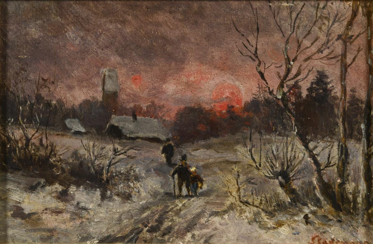Oil/painted cardboard. Signed lower right, verso inscribed.