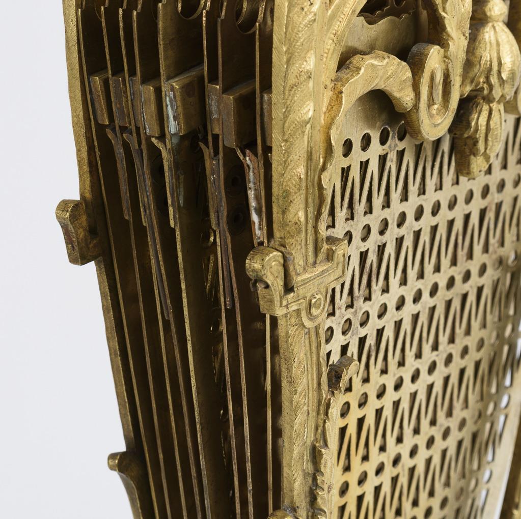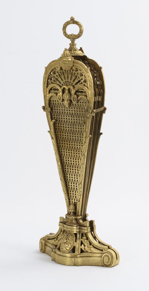 In the style of the late Baroque elaborately relieved stand with carrying handle for the total of 8 fanable umbrella segments with À-Jour ornament. 3 guide lugs professionally repaired, 1 locking lever missing.