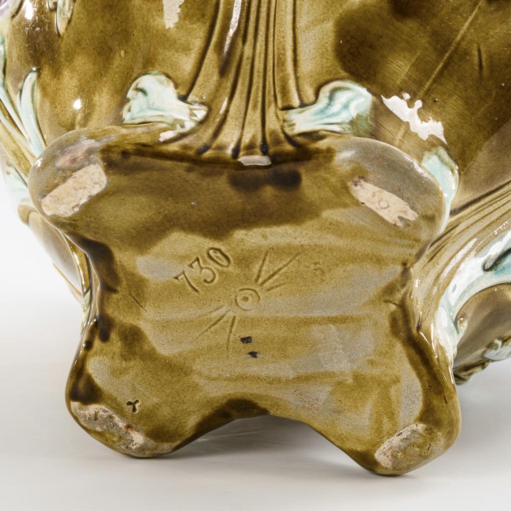 Four-pass cachepot with floral relief decoration and 2 handles. 1 handle with missing tendril, 1 handle with fine crack, slight glaze flaws.
