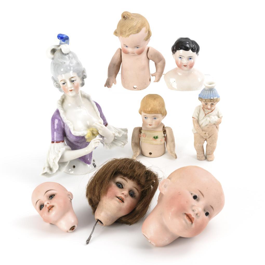 Crank full head (341) with painted eyes, small crank head with blue sleeping eyes and brown human hair wig, small crank head (1079) with blue glass eyes, without wig. / 2 half dolls made of bisque. / Breast head and tea doll bust of glazed porcelain. / Small Nippes joke figure "Manneken Pis". Tea doll bust with small bump on the hands, 1 head with bumps on the earlobes.