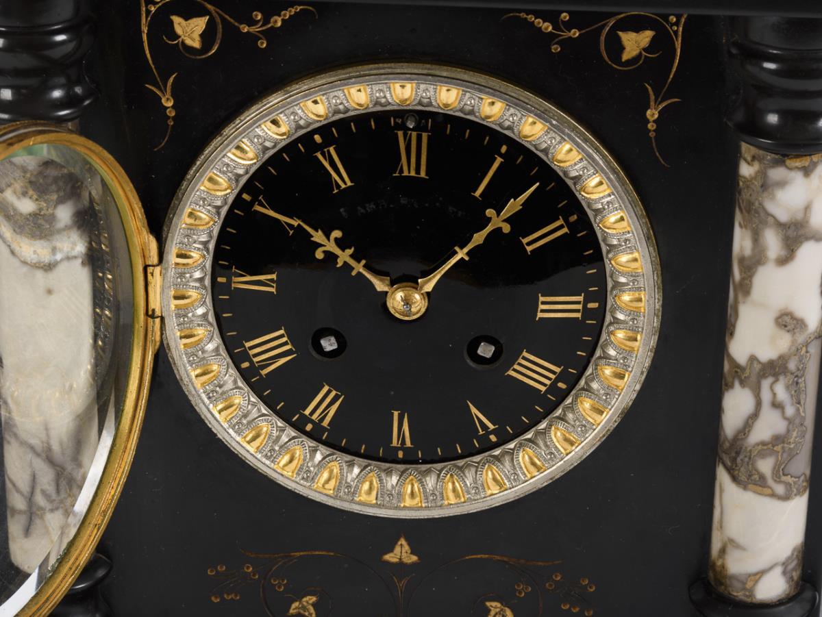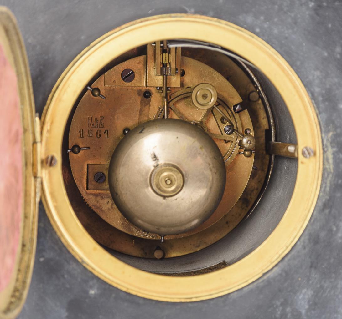 "S. Marti & Cie." Marked movement with half-hour strike on bell, dealer's mark "H&F Paris". Runs. Black enamel dial with Roman numerals, minute ring and spear hands, indistinctly marked.