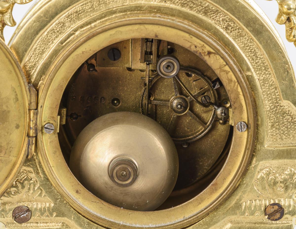 brass. Clock approx. 50 x 28,5 x 13 cm, 7 kg. Side plate H 61 cm, 3.1 kg each.