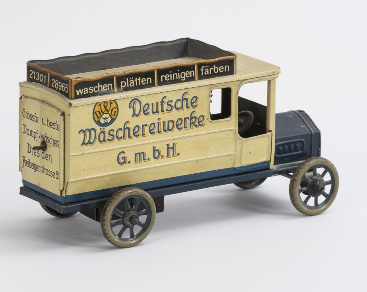 Cream colored van with driver figure and inscription "DWG. wash, flatten, clean, dye. Biggest and best steam laundry Dresden, Freibergerstrasse 51". Rare promotional item of the laundry. Work intact, with fixed key. Minimal paint abrasion.