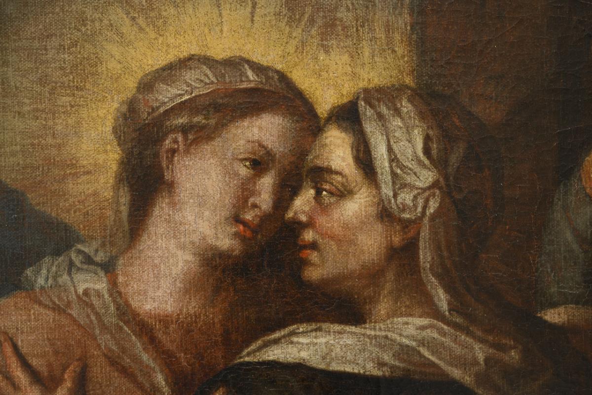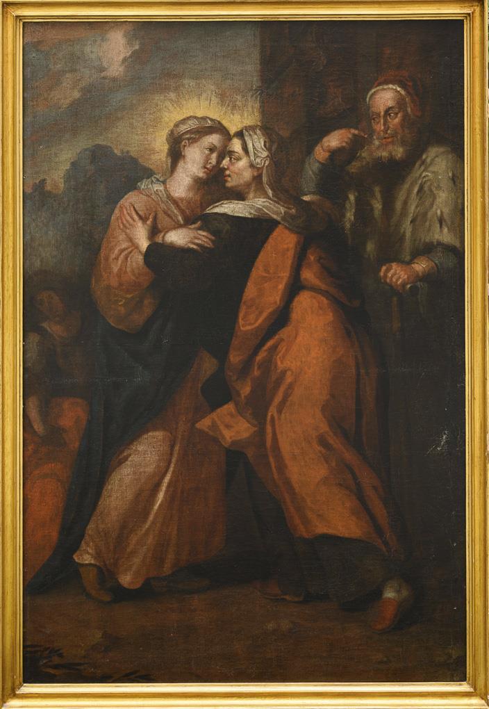 Two women in friendly embrace next to elderly ruler in front of a mountain range. Traces of age.