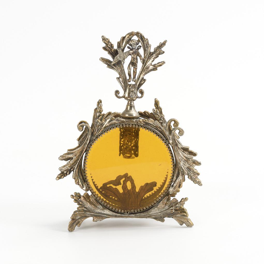 Glazed on both sides, richly decorated show container with screw-in flacon; its stopper with cupid handle as crowning. Inside flacon lining and a dove on branches.