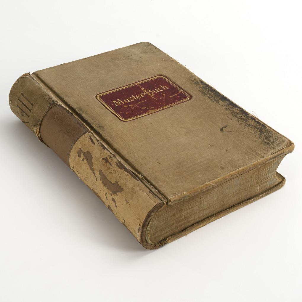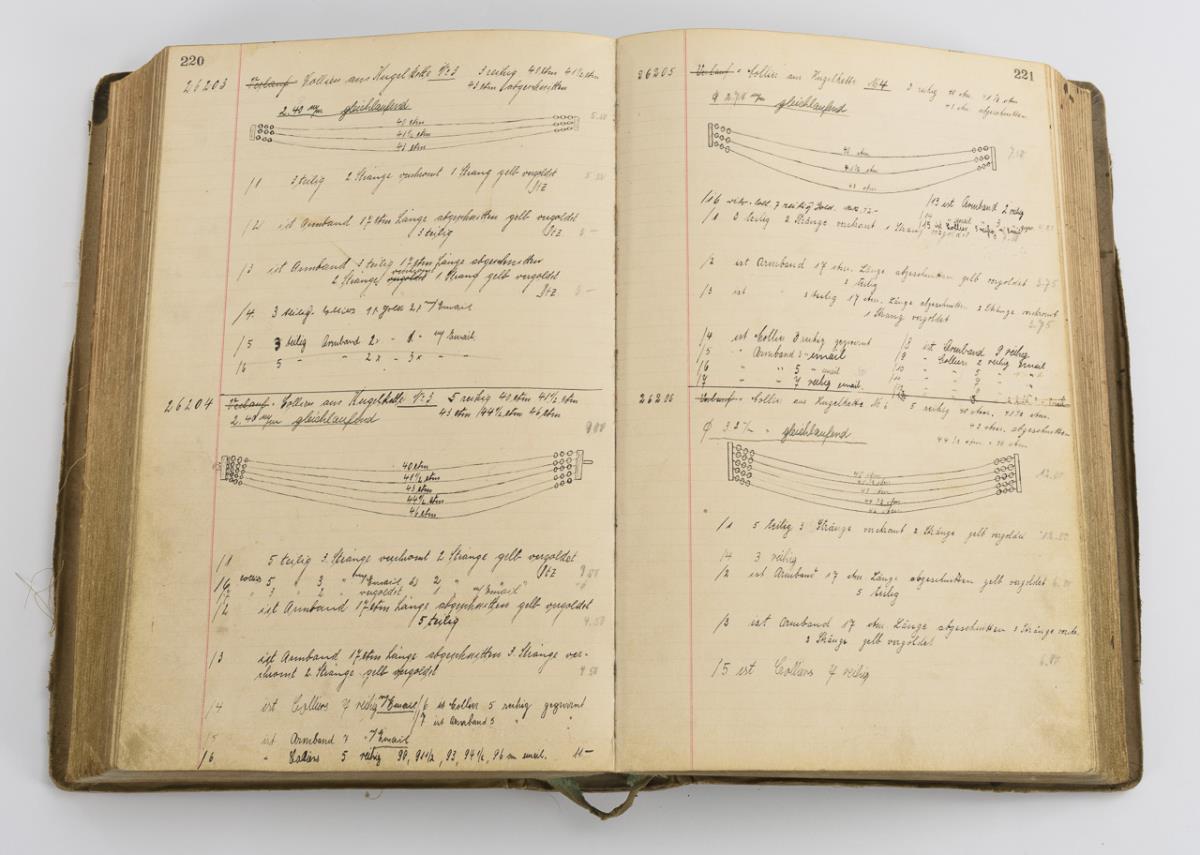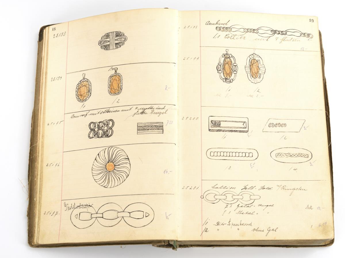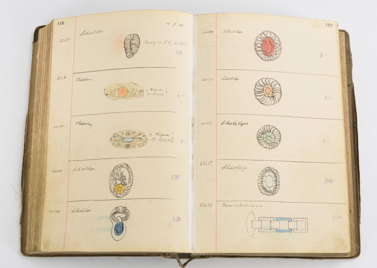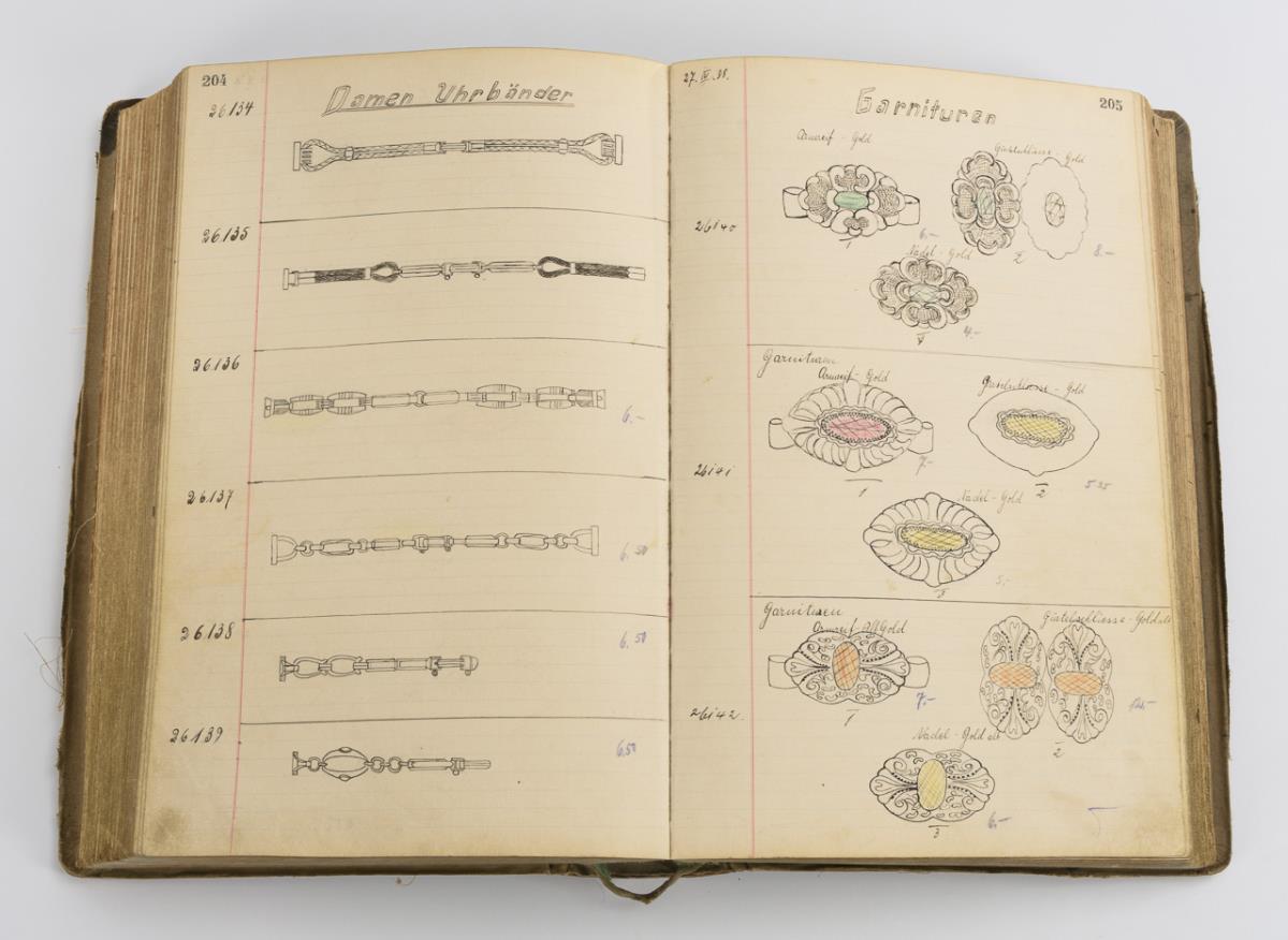 Jacob Bengel, Idar Oberstein, sample book volume XIII, from 29.1.1937 to 1.6.1939, no. 25116 to no. 26928. Hand-drawn, partly colored patterns on strong cardboard pages with details of the patterns or the materials used (metal, gagalith, tortoiseshell, glass, etc.), (partly with indication of the material origin, e.g. Pforzheim / Galblonz). 40 x 29 cm
