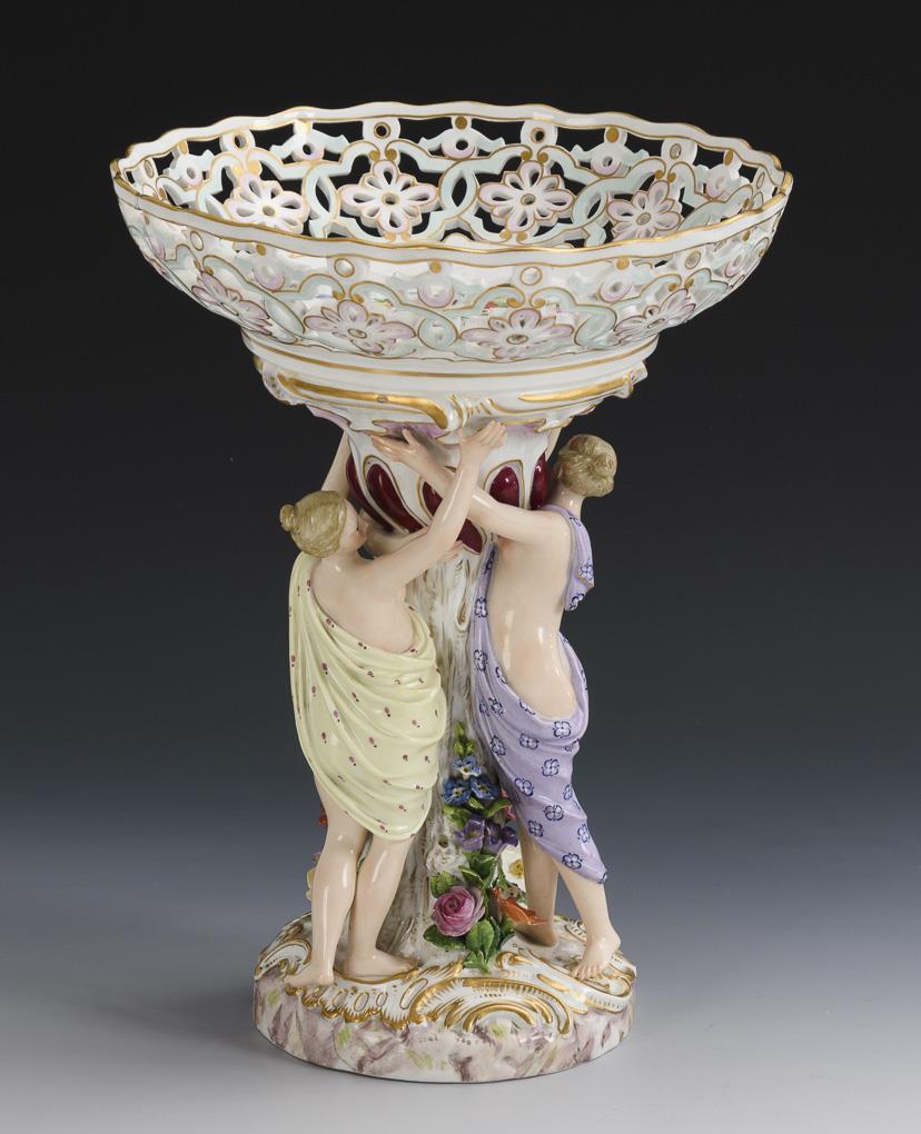 Three women standing around a tree trunk shaft holding a breakthrough bowl aloft. Restoration to the base, flowers and upper shaft area.