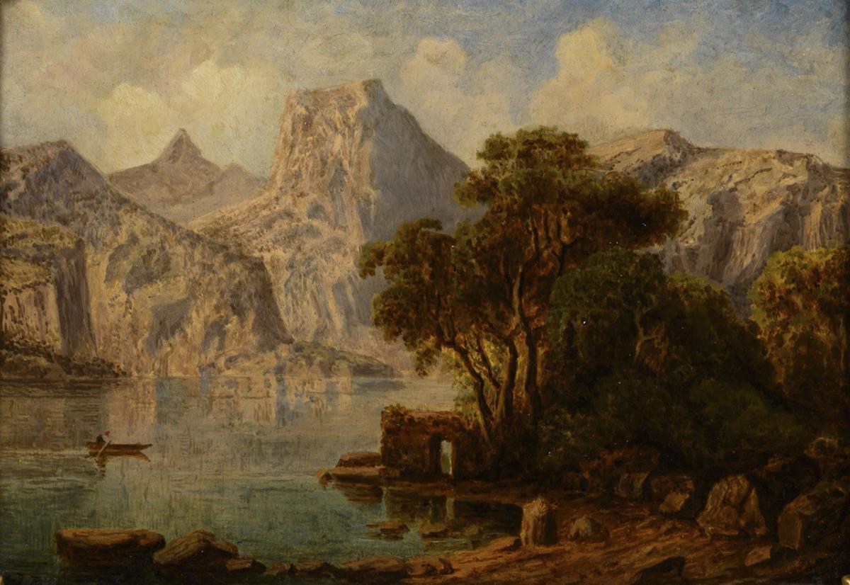 Punter in the sunshine on the quiet lake near a ruin between trees. Traces of age.