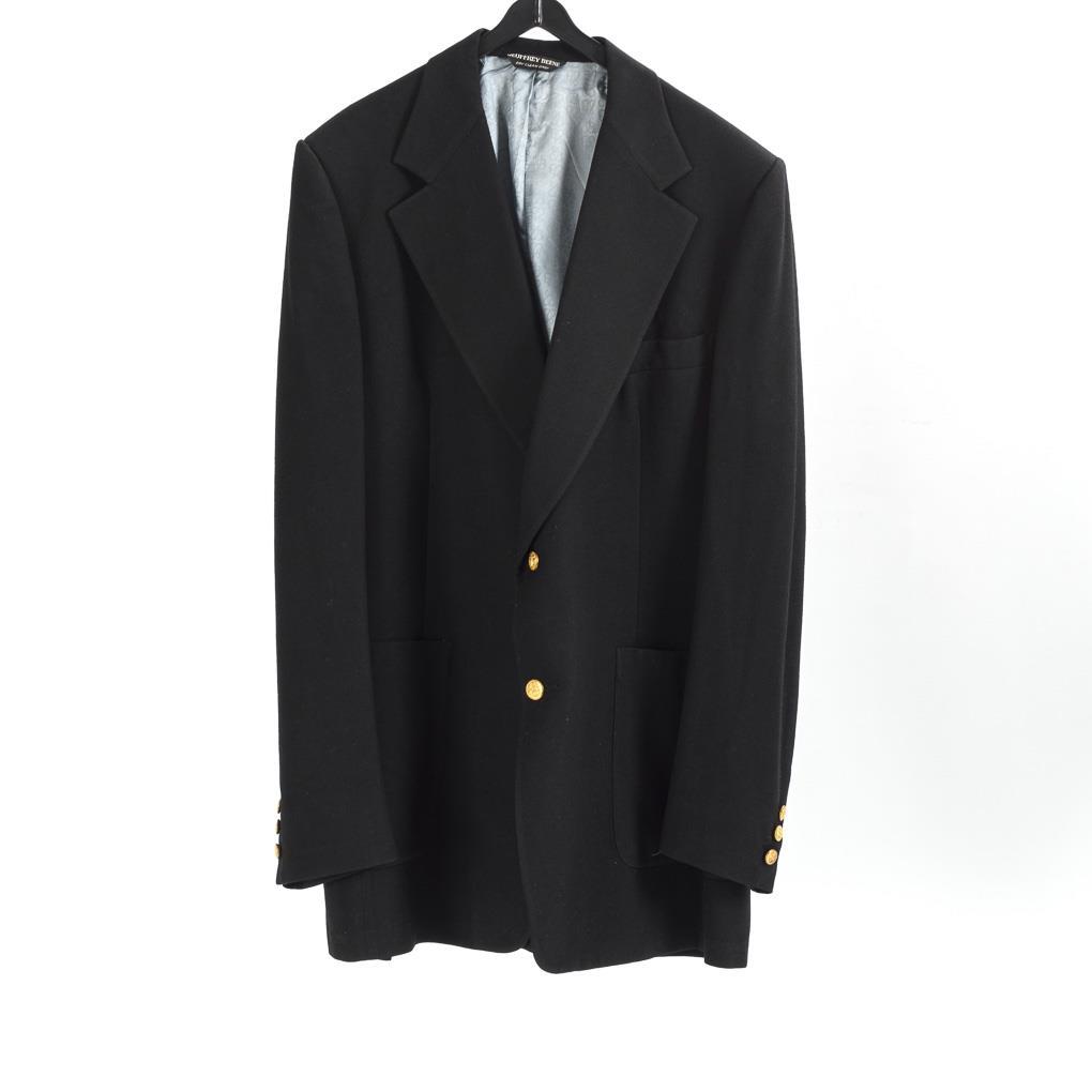 Black single-breasted jacket with 2 buttons and falling lapels, 2 flap pockets and built-in breast pocket and 2 side slits at the back. Inside partially lined and 2 pockets. Geoffrey Beene was one of the most famous American fashion designers, who founded his own company in 1963 and received several höchste awards.