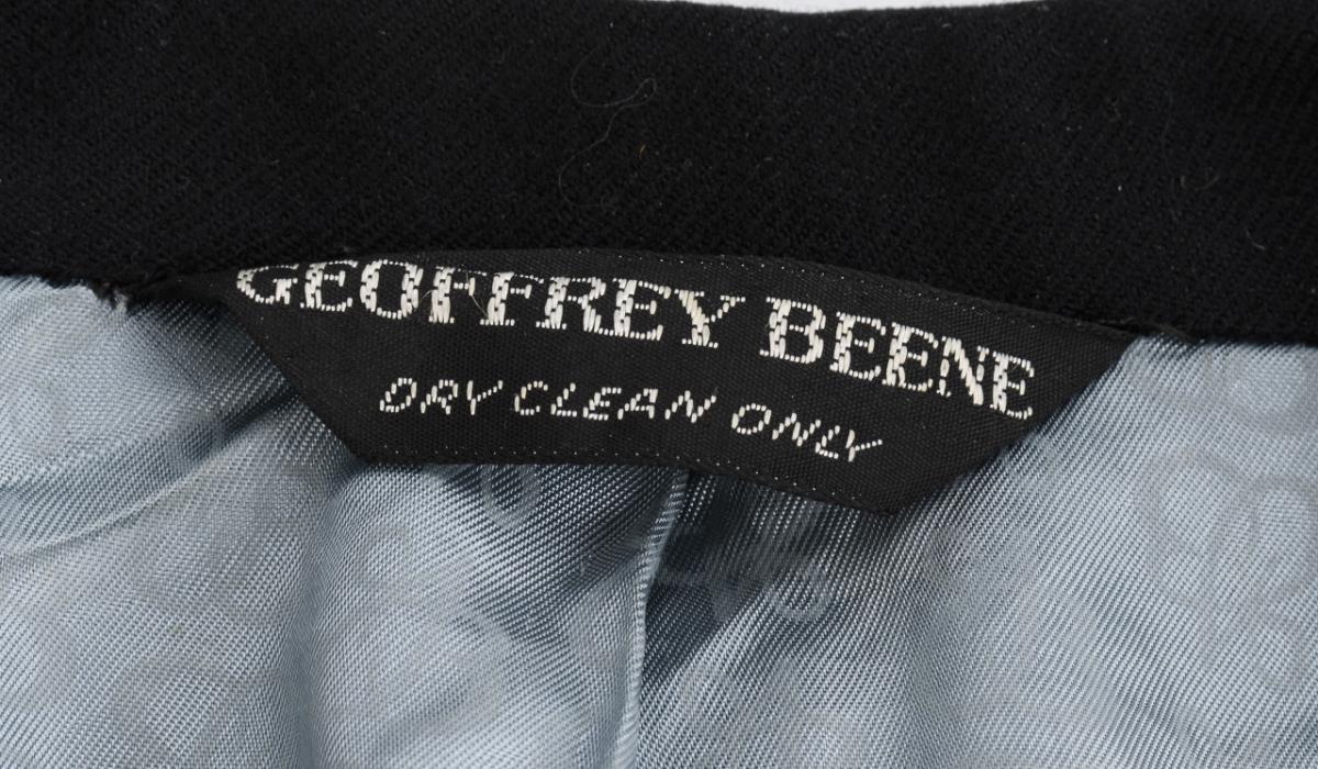 In the collar and lining label "Geoffrey Beene", buttons and lining with label monogram. Inside pinned label of dry cleaners "One-Hour Carriage Tree Cleaners" with no., outside Sotheby's hang tag with lot no. 604.