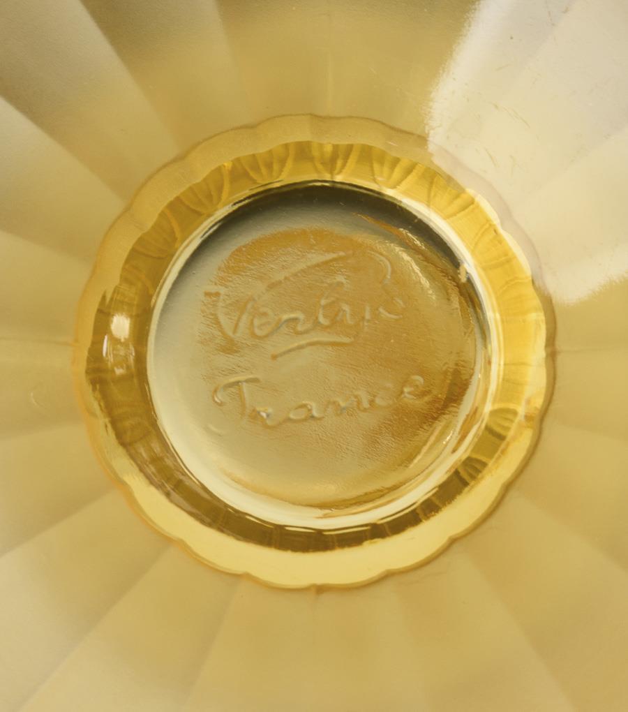 Amber molded and partially frosted glass with geometric relief pattern. 1 bowl (Ø 27,5 cm), 12 dessert bowls (Ø 15 cm).