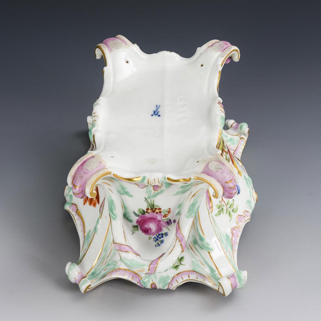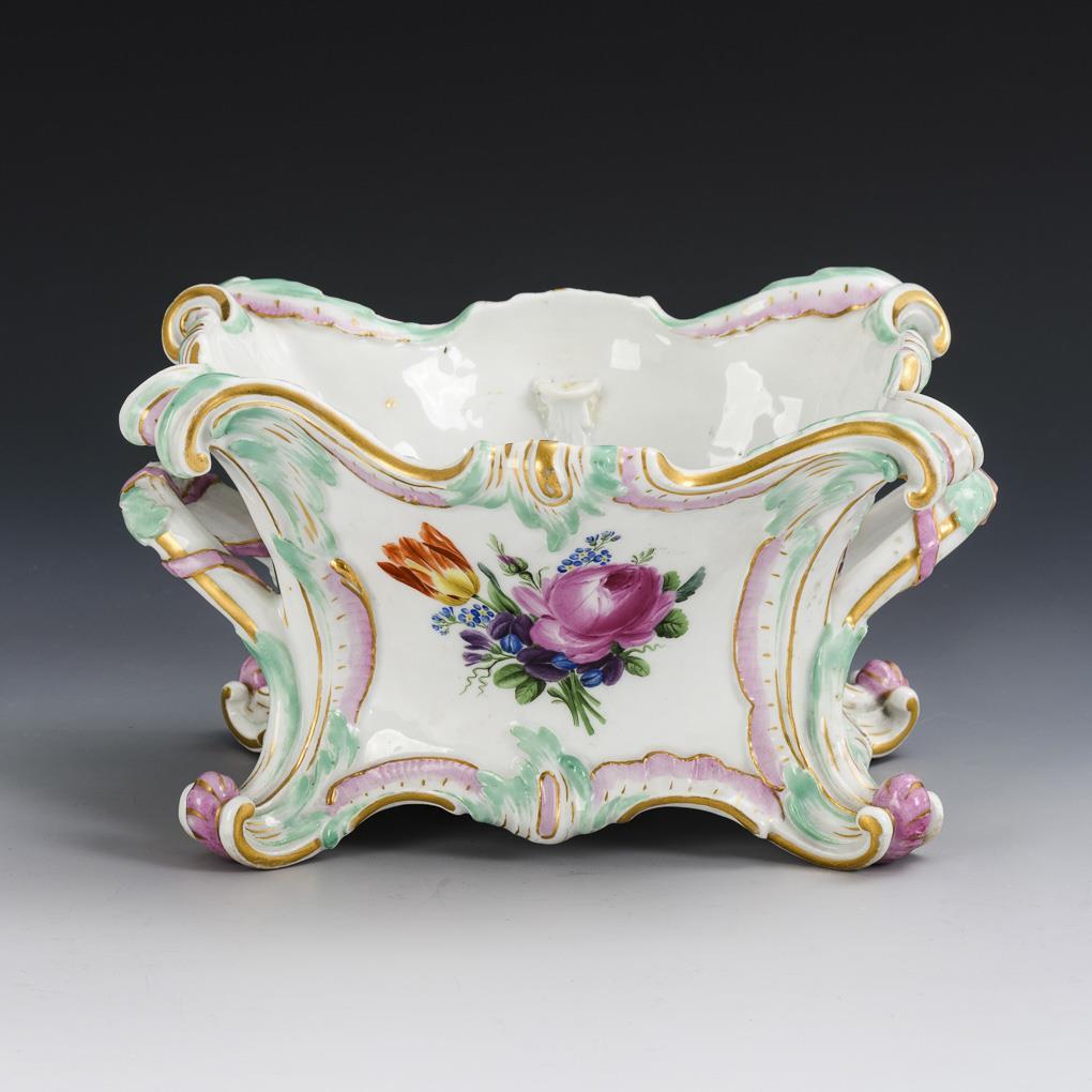 Rectangular rocaille bowl with four rocaille feet and two handles, inside 4 small fixed brackets for placing the insert (this is missing). On the front the representation of exotic birds sitting on branches, verso a bouquet of flowers.