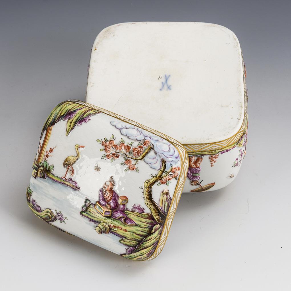 Polychrome painted, gold decorated. 10 x 13.5 x 12 cm.