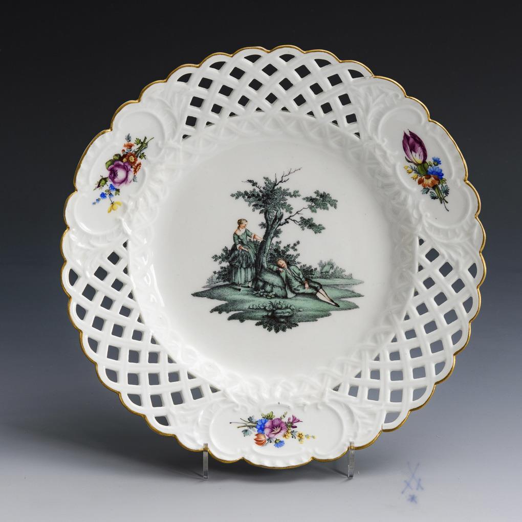Polychrome painted, gold decorated. Ø 23,5 cm.