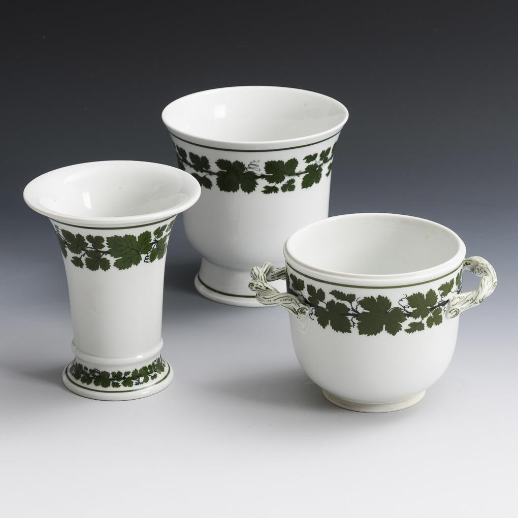 Vase and 2 cachepots with vine leaves decor. Meissen.