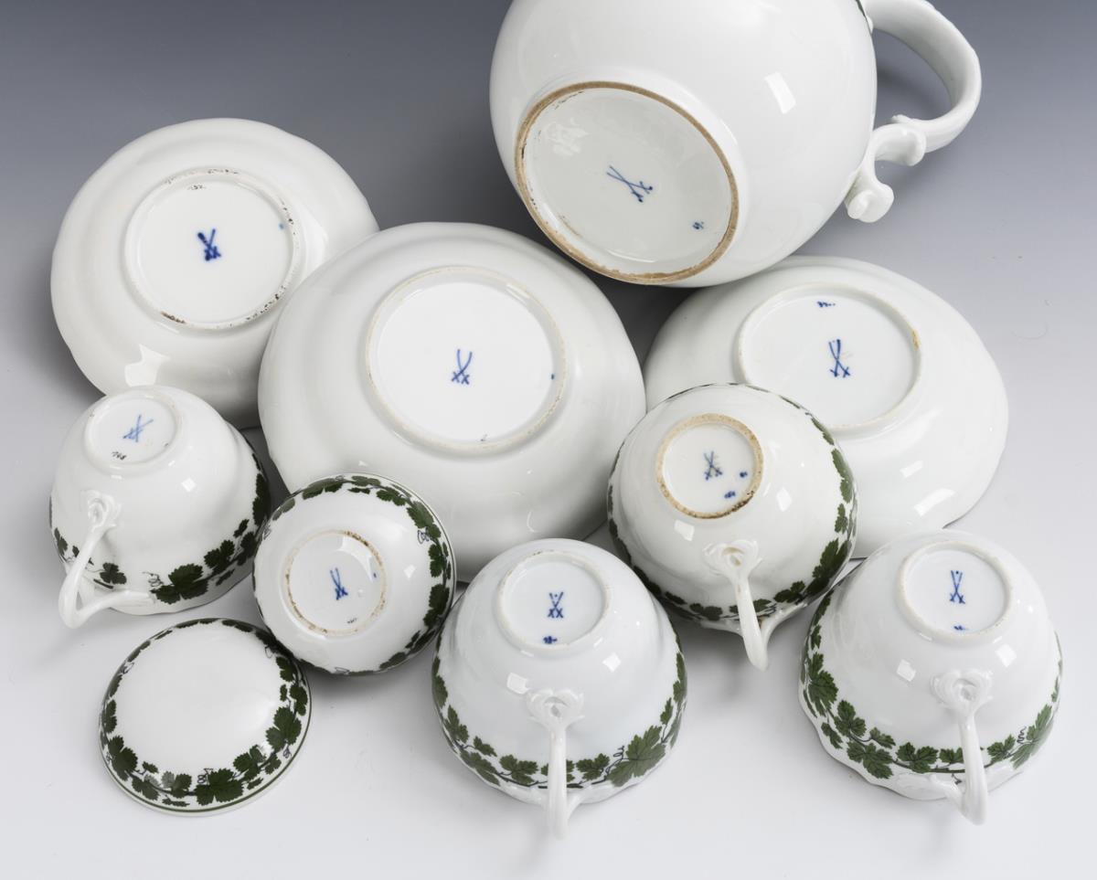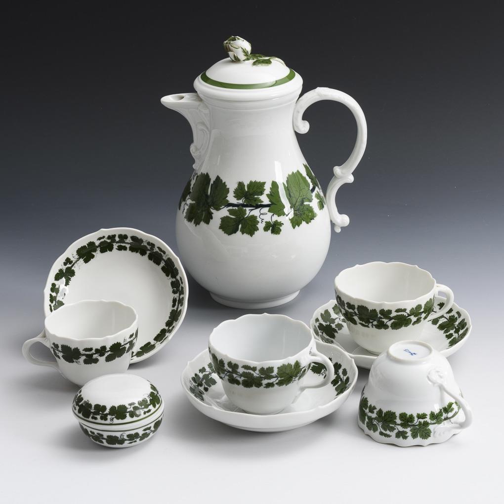 Coffee pot, 4 cups and box with vine leaves decor. Meissen.