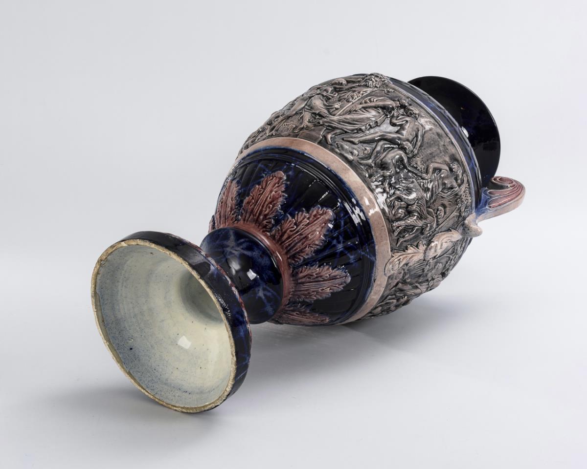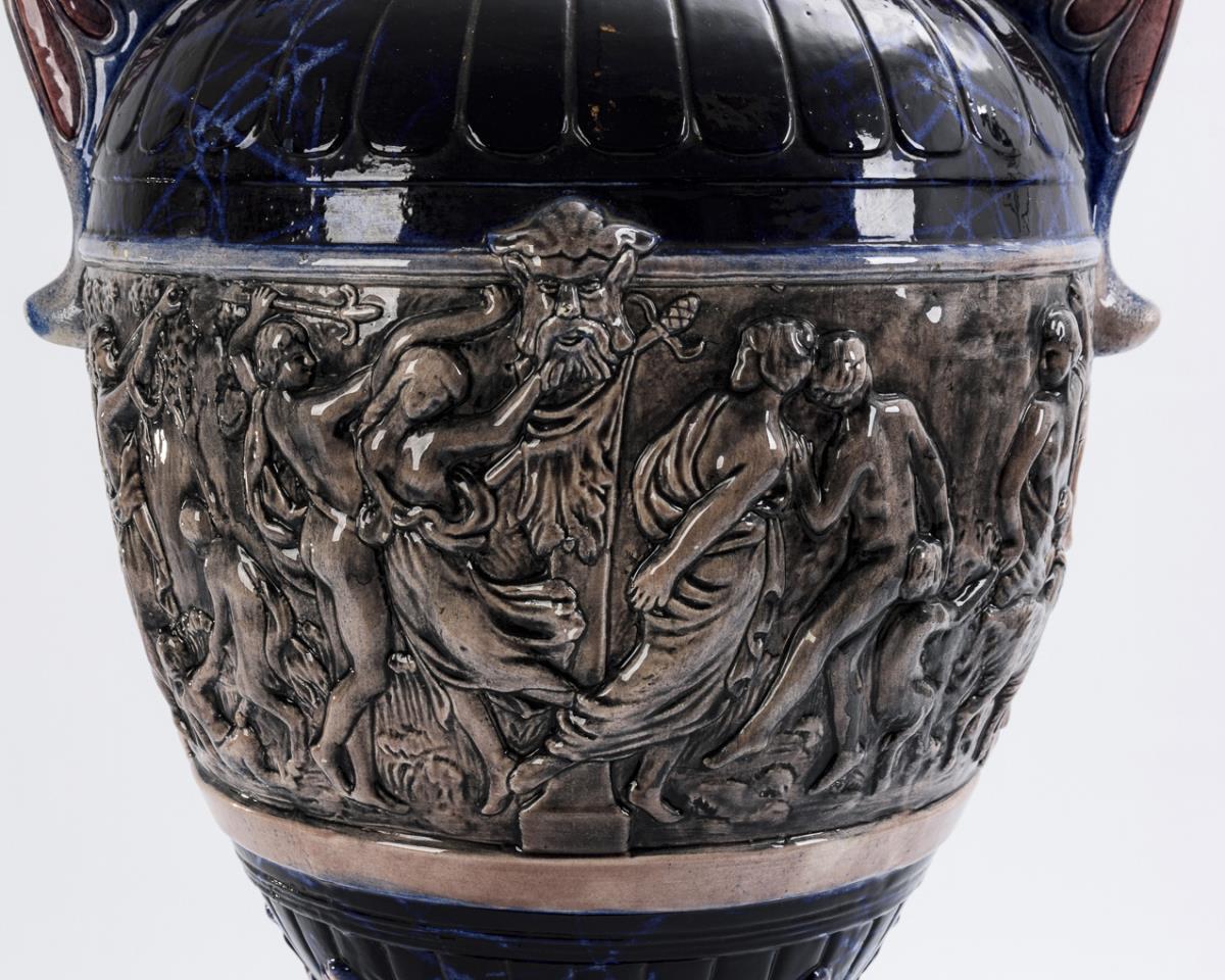 Antique baluster vase with voluted handles, leaf reliefs and round base. Surrounded by a historicist wall frieze with various figure scenes. With plastic vase insert. Partially bumped, at the stand partly retouched bumps.
