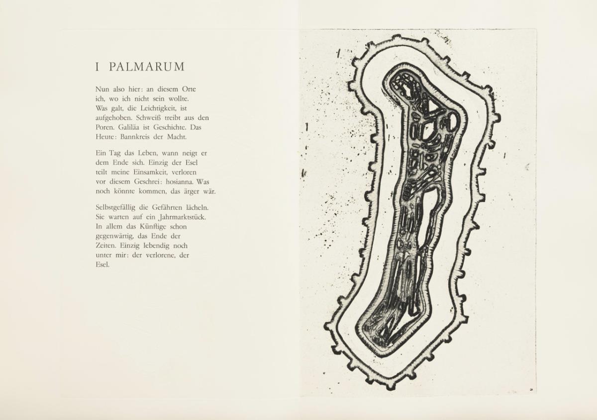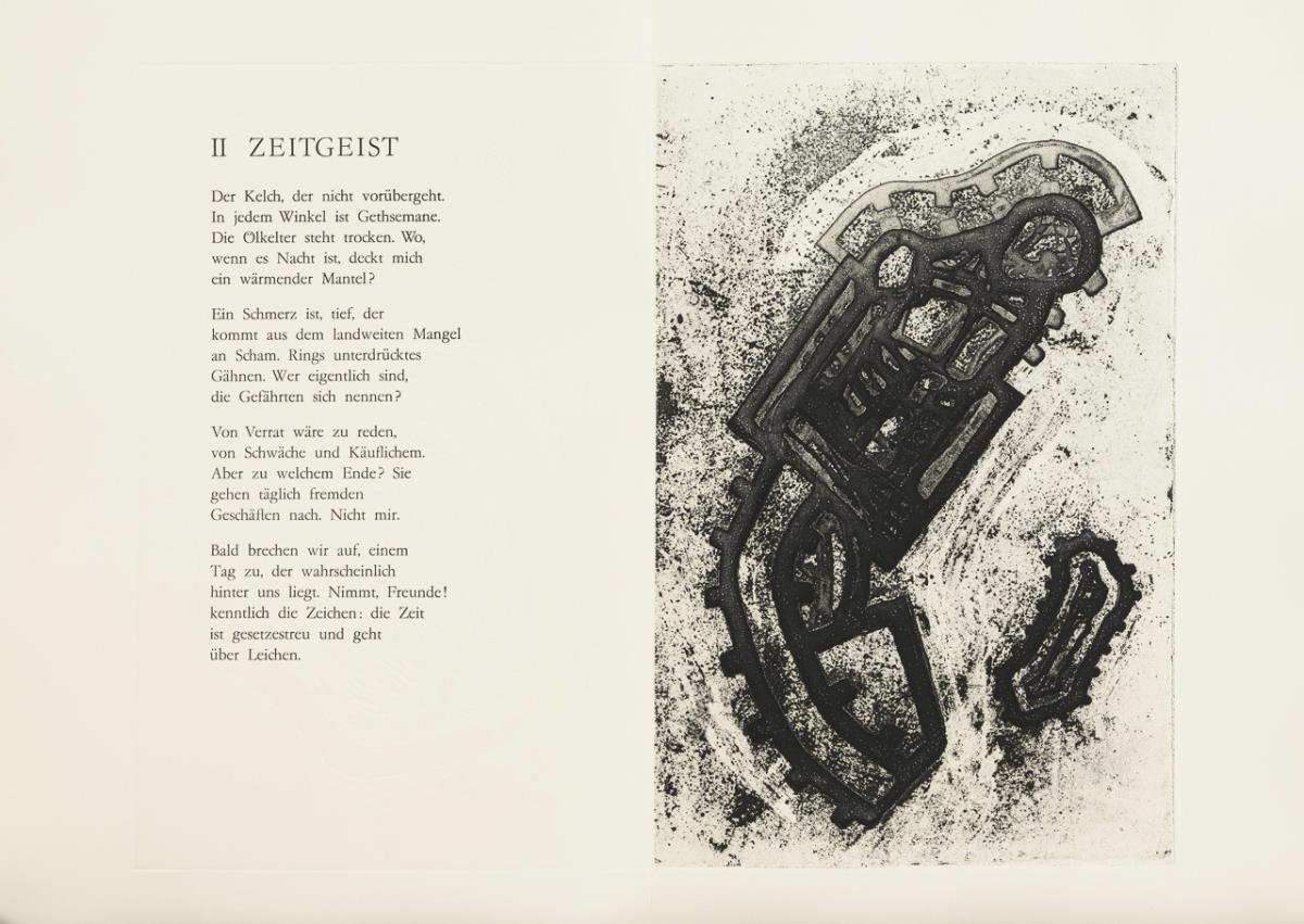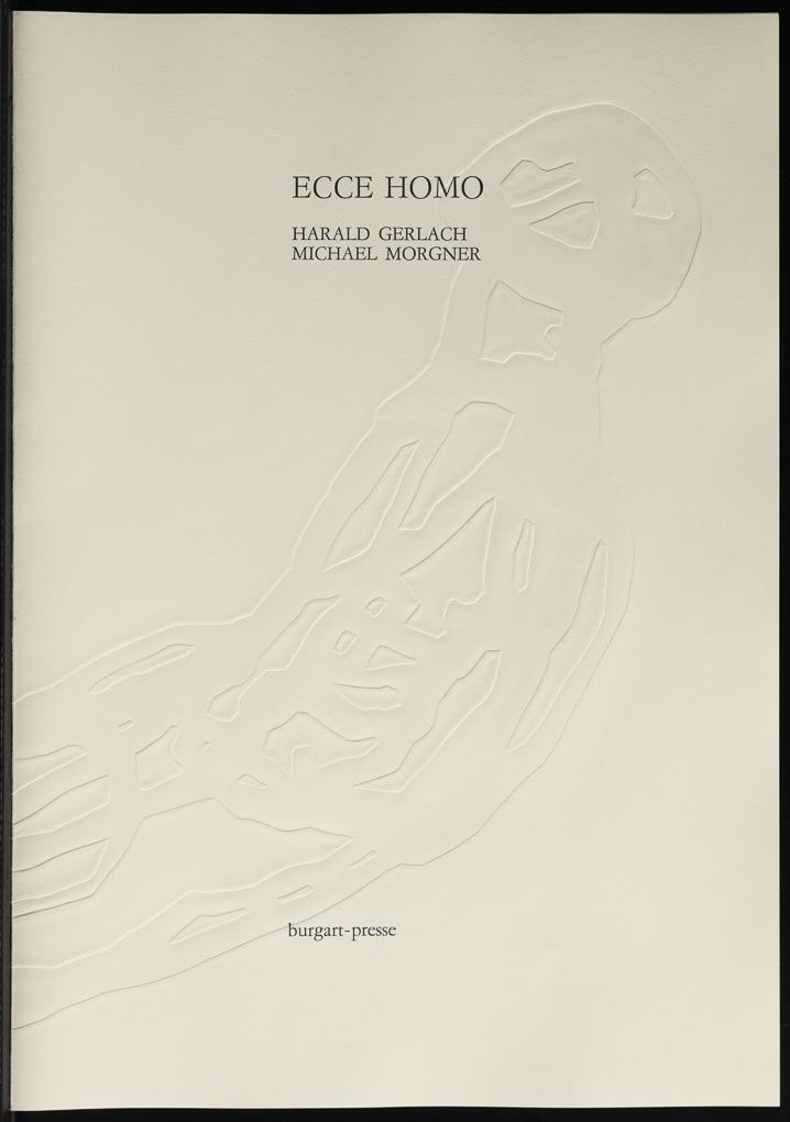 Complete portfolio, out of print in the trade, with 9 etchings and 10 blind prints by Michael Morgner to the 9-part poem cycle "Ecce Homo" by Harald Gerlach, imprint with pencil signature of the author and the artist (= 12. Print of the burgart-presse).