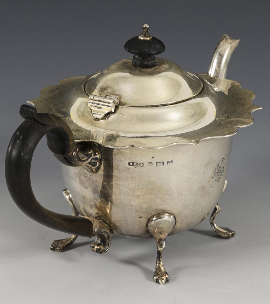 Flat teapot with ebonized handle. On 4 curved legs. Some dents, feet compressed.