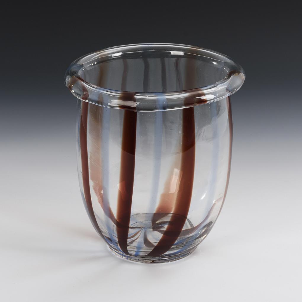 Vase of colorless, slightly streaky glass with fused vertical stripes in opaline light blue and brown; downturned mouth rim; tear.