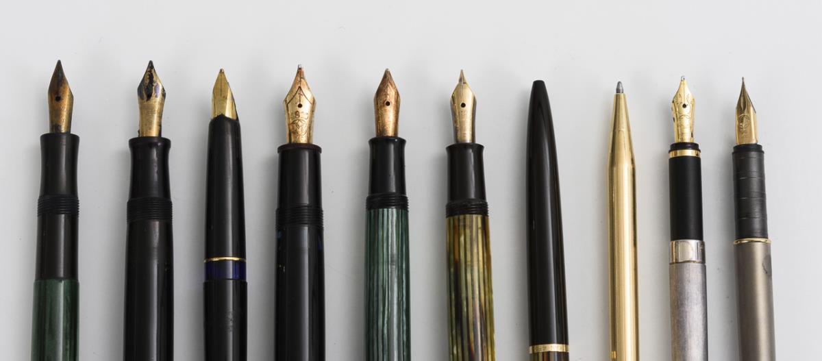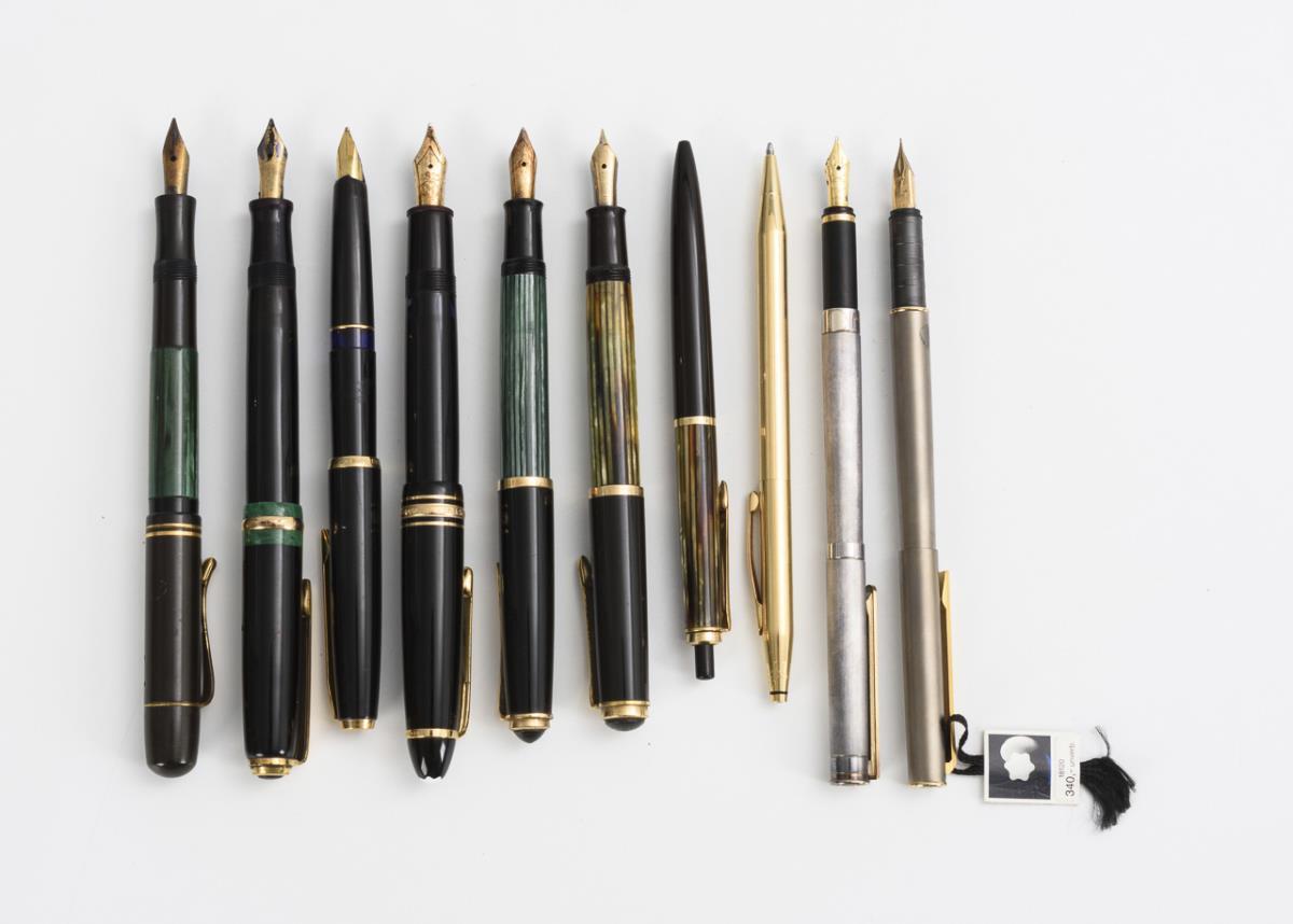 6 plastic piston fountain pens (1x "Montblanc Meisterstück No. 146", 4x Pelikan marked). Unmarked fountain pen with malachite green celluloid ring and "Greif" marked nib. 2 Montblanc stainless steel cartridge fountain pens. All fountain pens with gold nibs 14 kt, 1x 18 kt. Gold-plated ballpoint pen "Cross" marked, Unmarked plastic ballpoint pen without refill. 1 Pelikan fountain pen with name engraving.