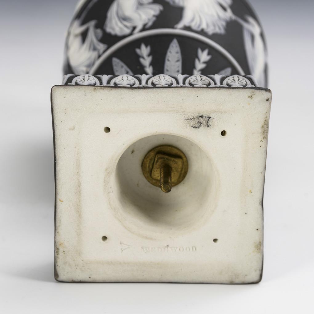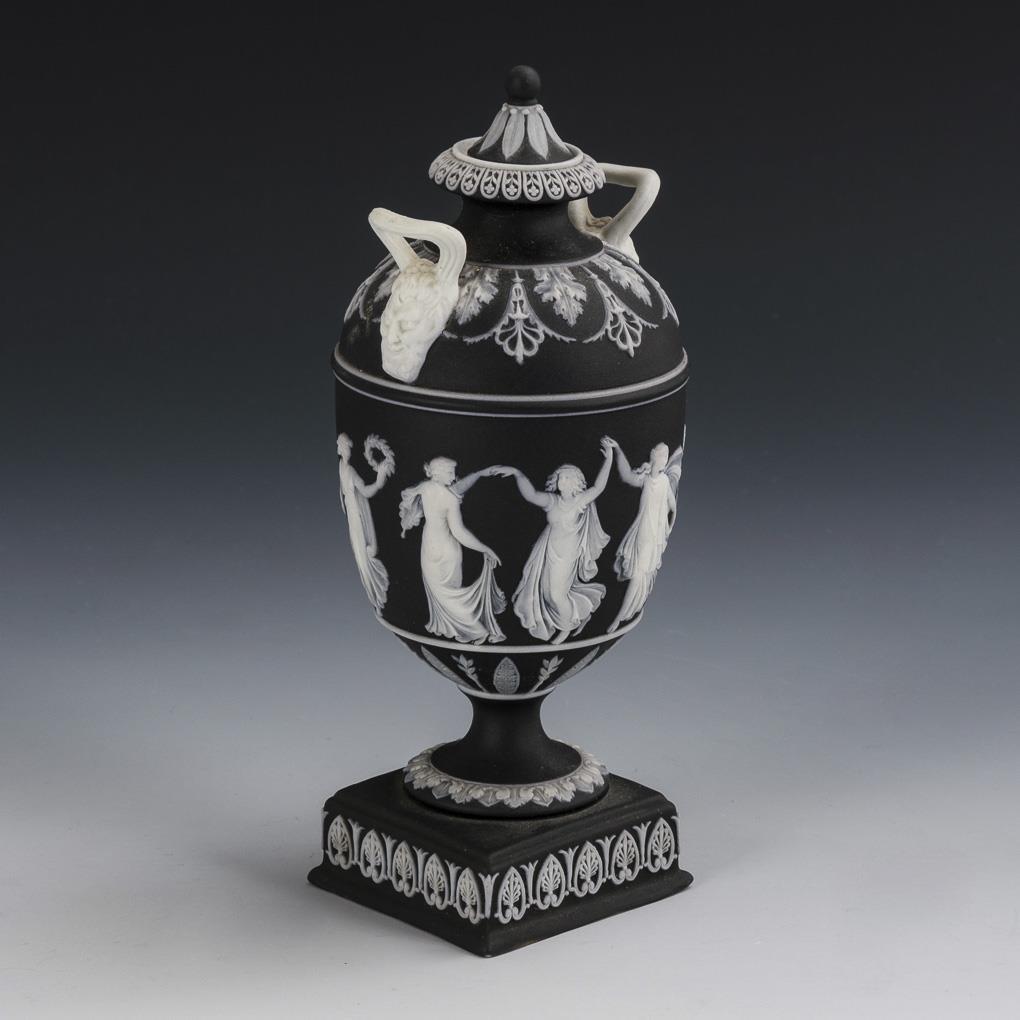 Baluster vase with two mascaron handles, knob lid and round base, on rectangular plinth. Black background, in the style of pâte-sur-pâte topped with dancing maenads and ornamental bands.