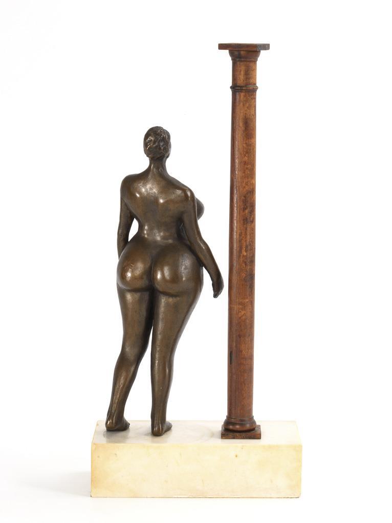 Fully sculptured female nude standing figure with overemphasized curvature next to slender column. Mild bumping to marble.