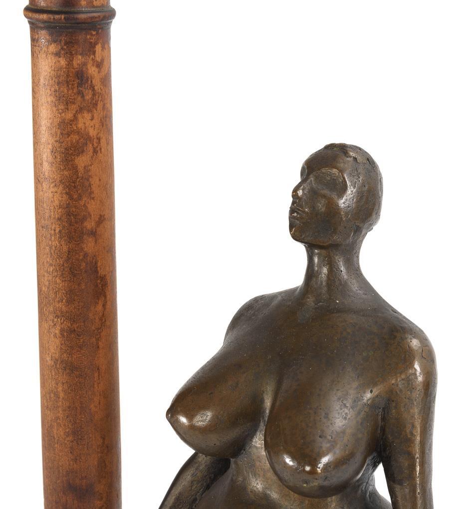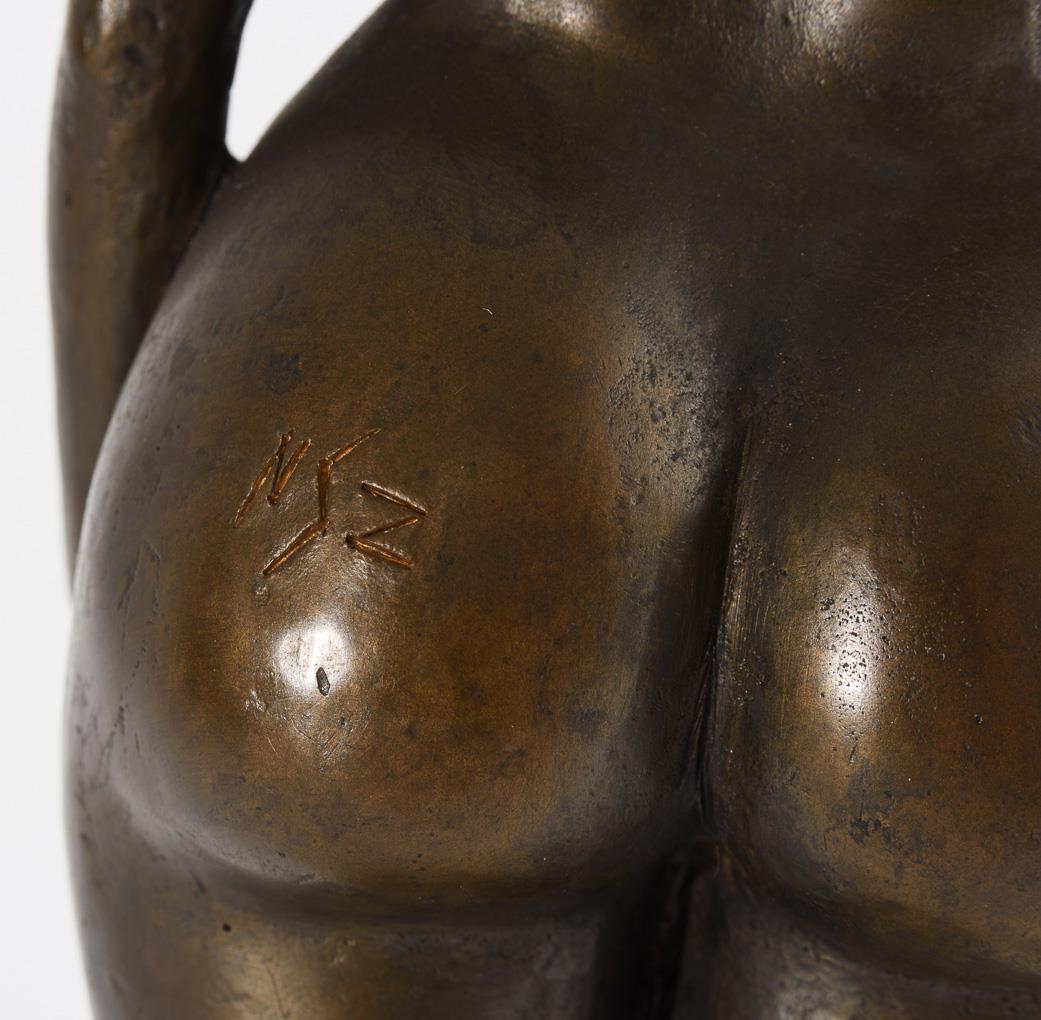Bronze patinated, white marble base, walnut wood column. Engraved monogram. H bronze 34 cm, total 49 x 23 x 11 cm. 8.0 kg.