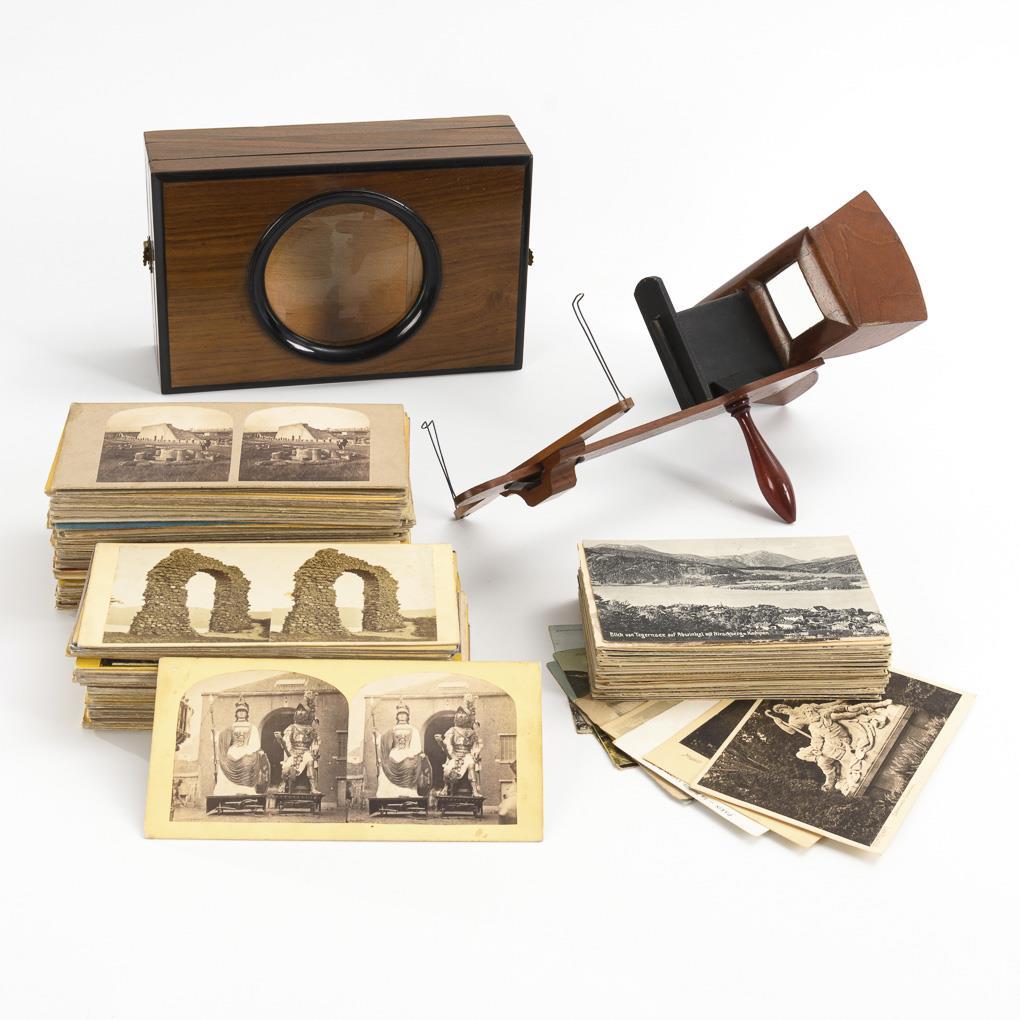 Stereoscope with magnifying glasses and sliding photo holder on the barrel. Hinged graphoscope with large magnifying glass and photo holder inside. Stereocards mostly with sights in Germany, Italy, France, etc., picture postcards mostly used, often with stamps. Only at the cards age / use traces.