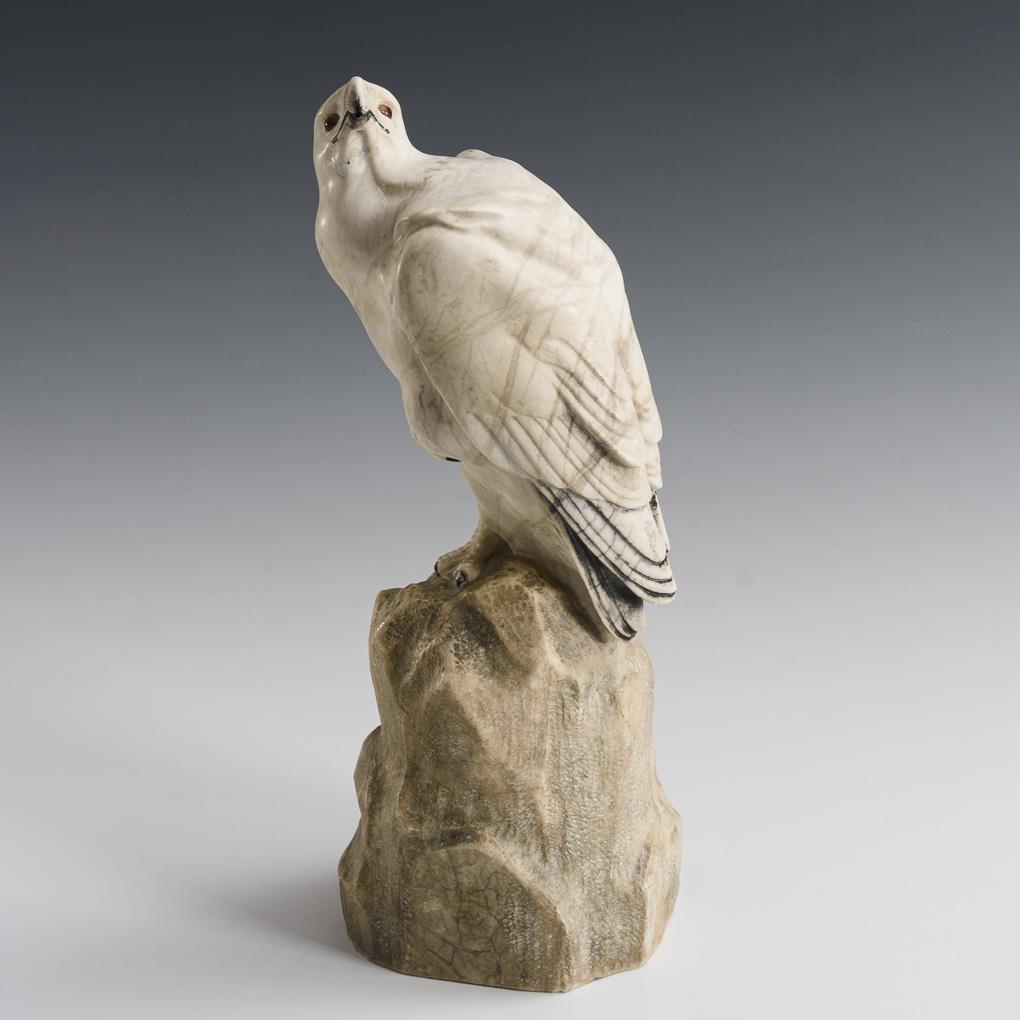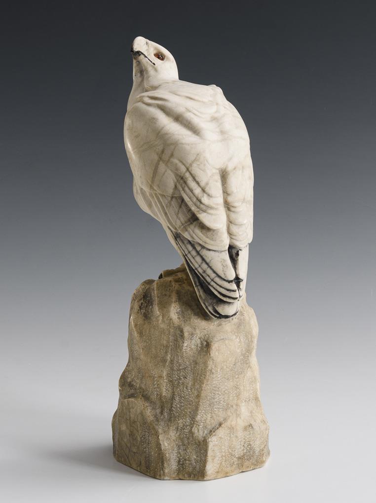 Light marble or alabaster, partly set, glass eyes. Inscribed. H 30,5 cm. 3.6 kg.