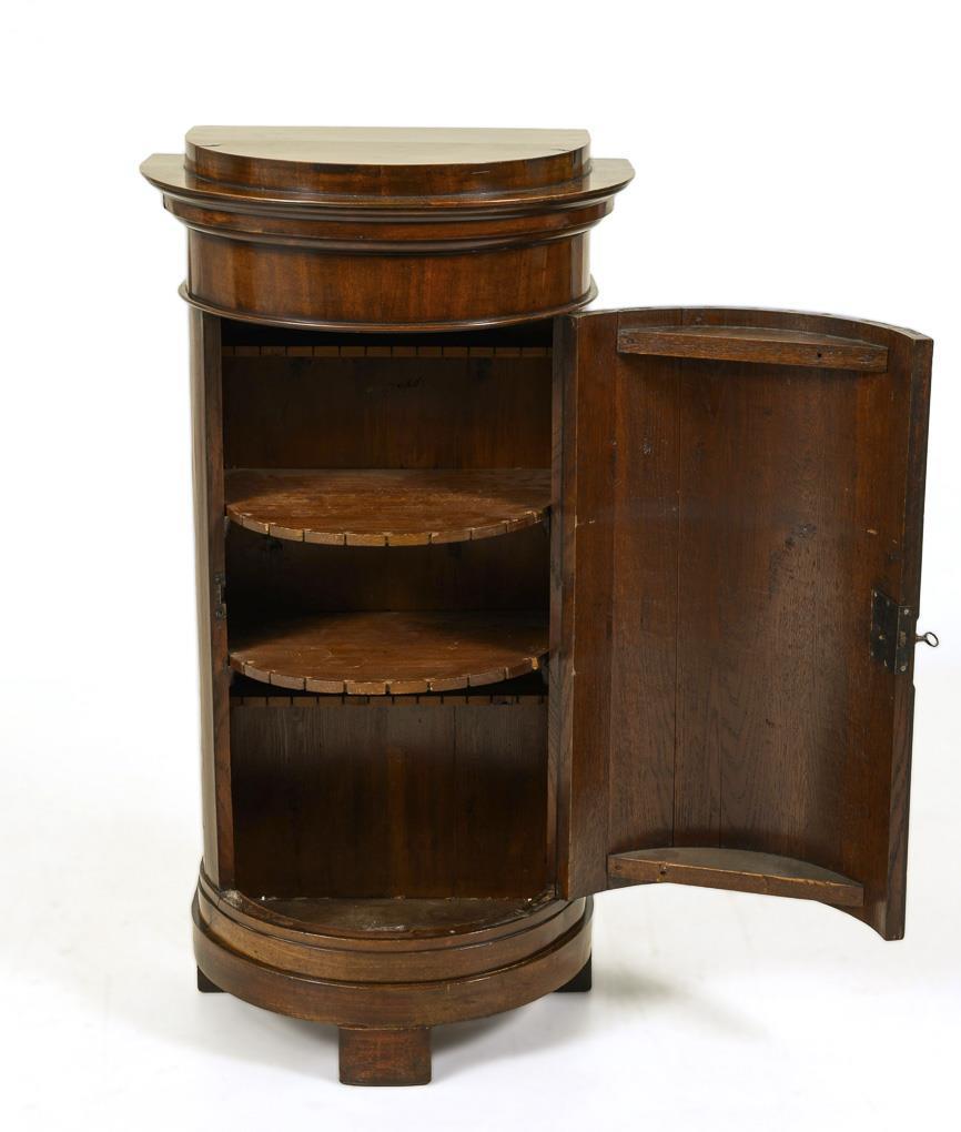 1-door pillar drum cabinet with round body, discreetly decorated with ribbon inlays and stepped top plate; inside 2 notched shelves and 2 notched shelves. Traces of age/use, veneer partly wavy and dry-cracked.