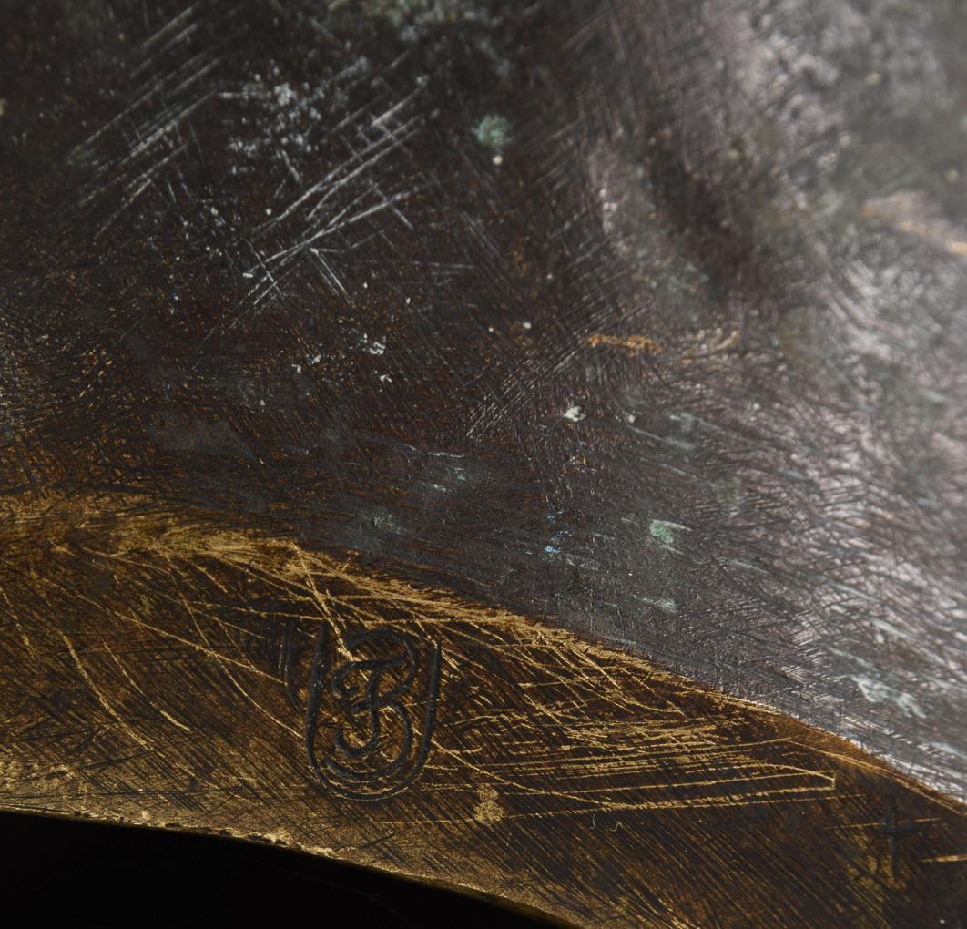 Bronze patinated, black / greenish marble base. Inscribed with foundry mark. H 36 / 43 cm. 25 kg.