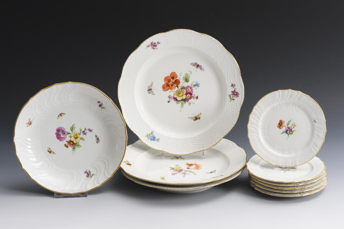 3+6 plates and 1 bowl with floral and insect painting. KPM Berlin.